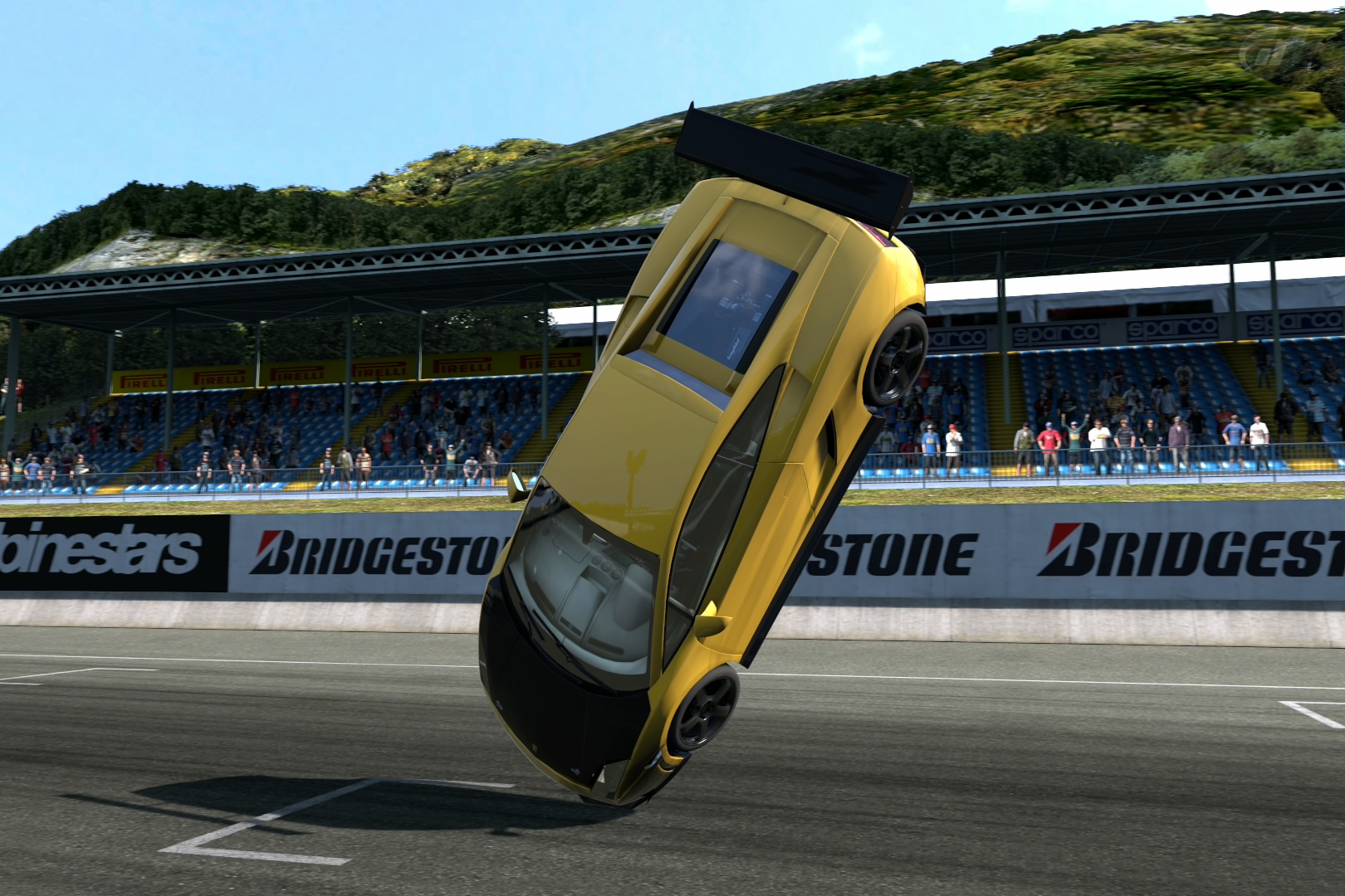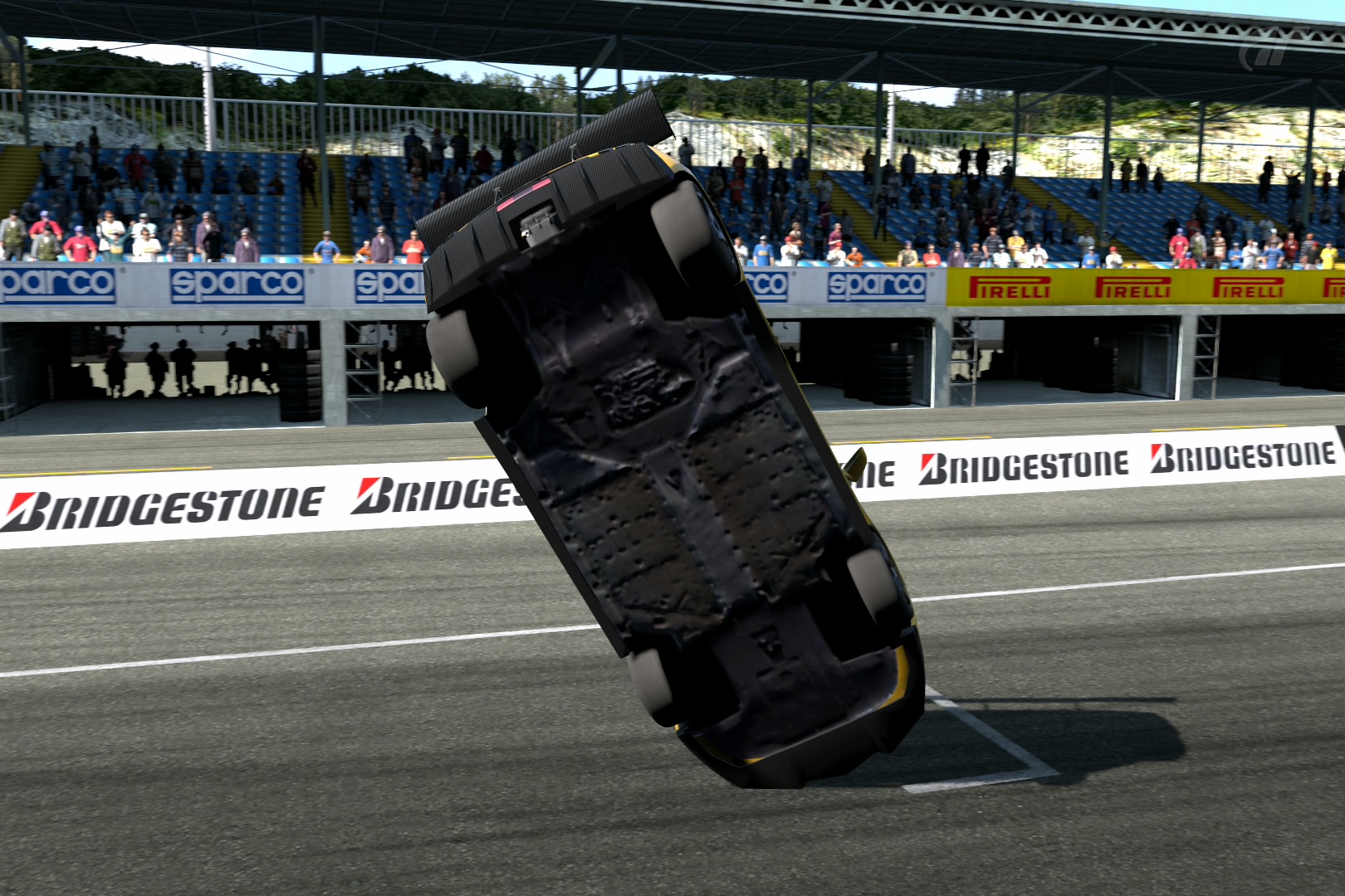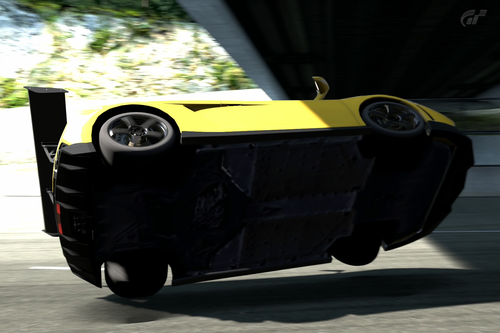 Someone in some early thread asked about the undercarriage shot of GT5. I finally was able to flip a Lambo in Trial Mountain to see how GT5 models the undercarriage....