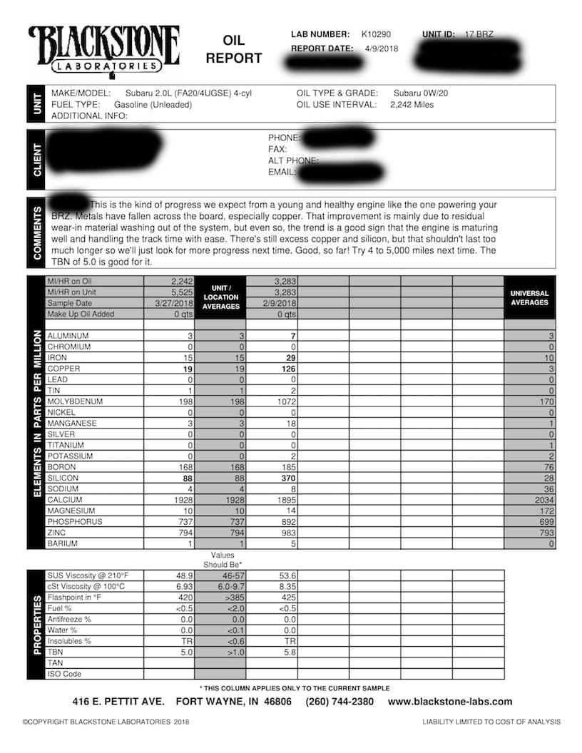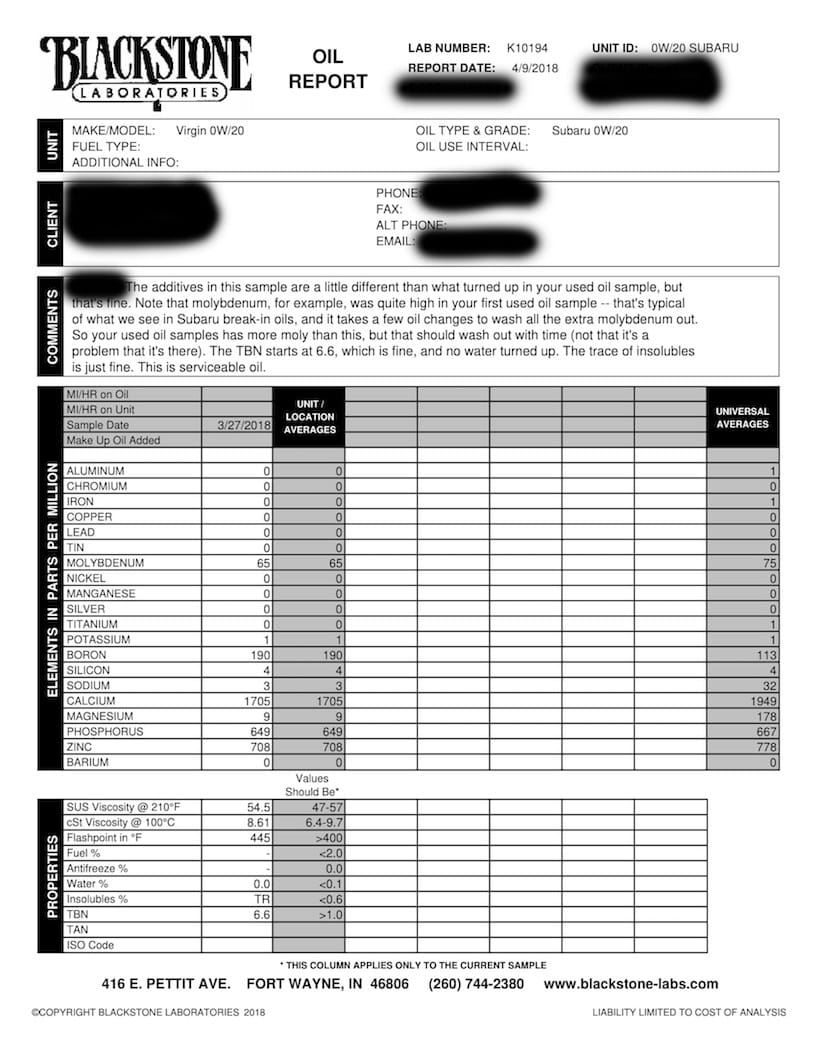 Blackstone Labs got back to me with the reports from the oil samples I submitted after my track day last month. I changed my oil and sent two samples, a used oil sample and a sample of virgin Subaru 0W-20 oil just for comparison purposes.