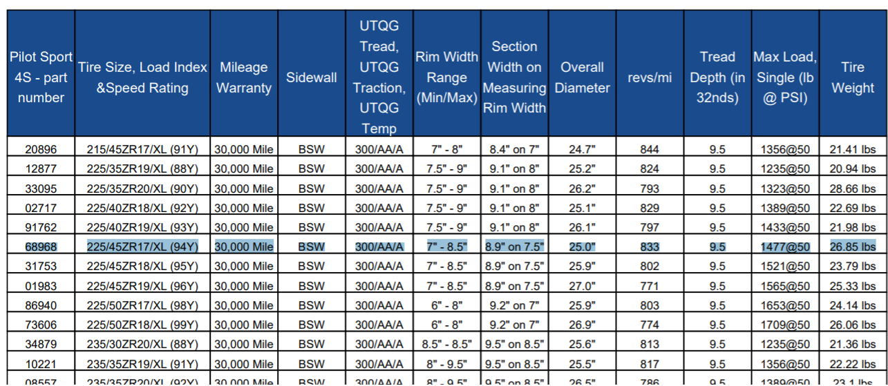 Called Michelin re: 225/45ZR17 Pilot Sport 4S at 26.85 pounds, they say "It's 26.85", then online chat with Michelin: "It's 26.85". Call Tire Rack, Felix, extension 4497, goes the extra mile and has one weighed... correct weight is 21.0. I purchased and confirm: