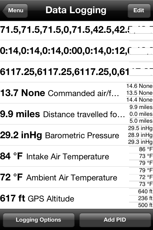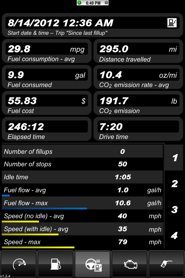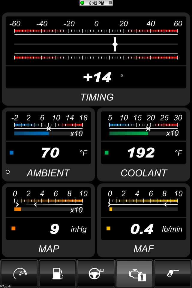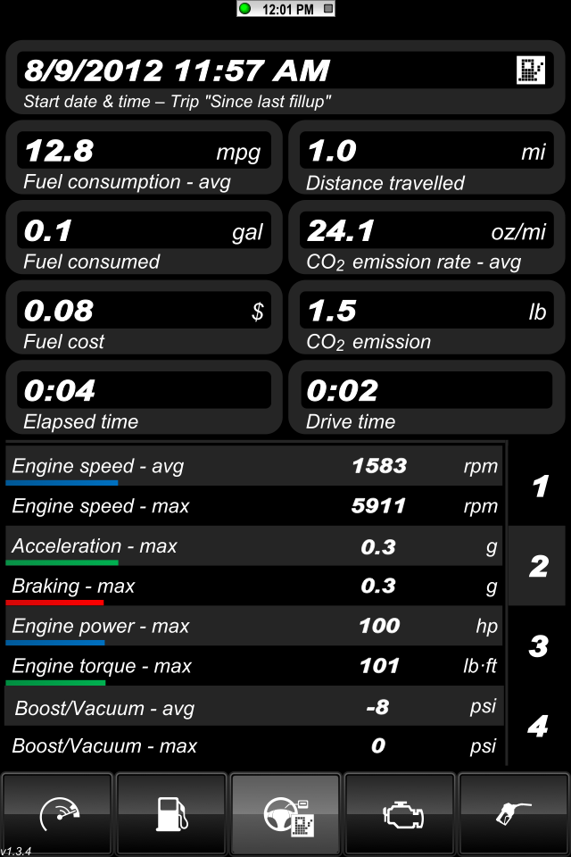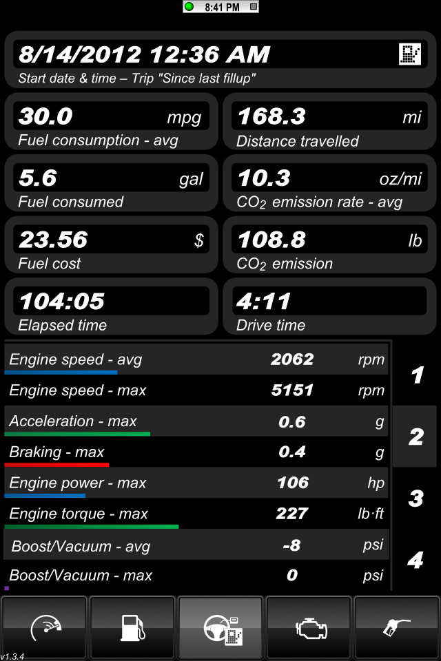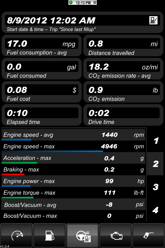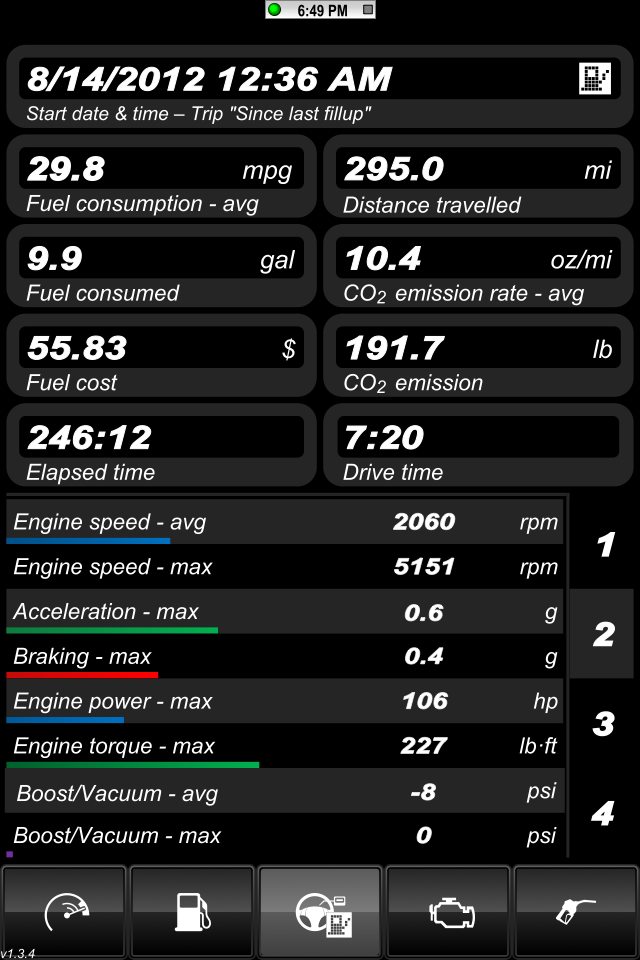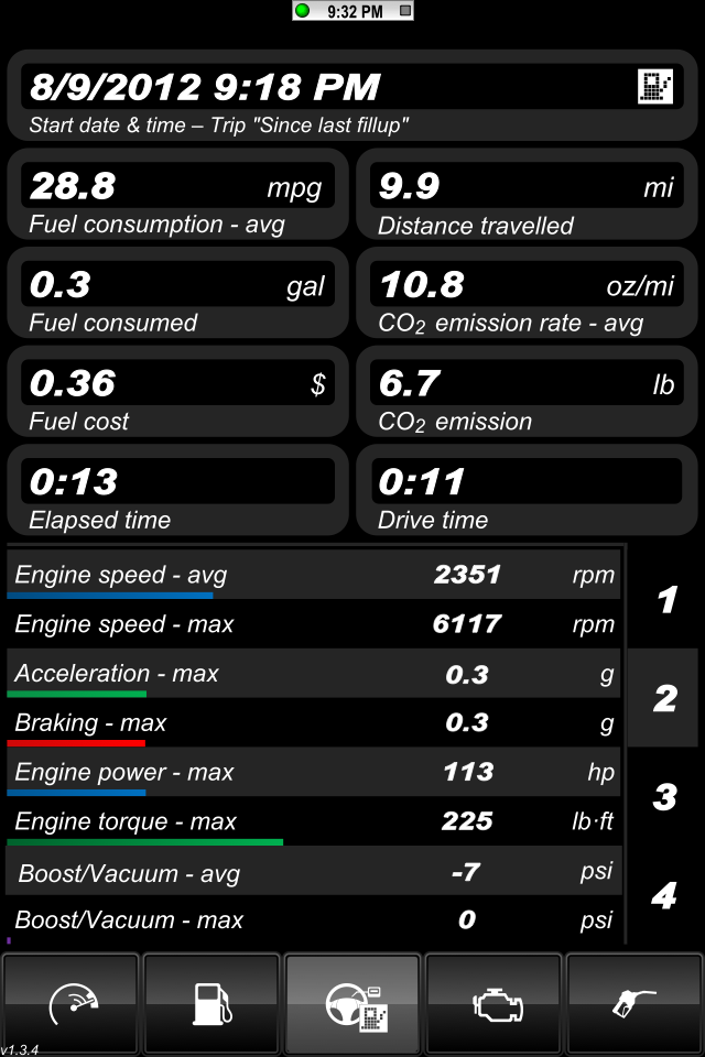 Here are the parameters I was thinking of logging: Avg Speed, Max Speed Avg RPM, Min RPM, MAX RPM, Intake Temp - Min Max Avg Ambient Temp - Min Max Avg AFR - Min Max Avg Elapsed time of drive Altitude - Min Max Avg There's a bit of a learning curve with this app. The user manual just covers the very basics. Here's some screens the default skin. This is from a very short drive across the highway to grab lunch. http://i1132.photobucket.com/albums/...s/IMG_0502.png Here's the ambient temo sitting at a red light http://i1132.photobucket.com/albums/...s/IMG_0504.png Here's the intake air temp at the same redlight just seconds apart. http://i1132.photobucket.com/albums/...s/IMG_0505.png Here's just a short trip for lunch: http://i1132.photobucket.com/albums/...s/IMG_0507.png http://i1132.photobucket.com/albums/...s/IMG_0508.png Ruskymx |