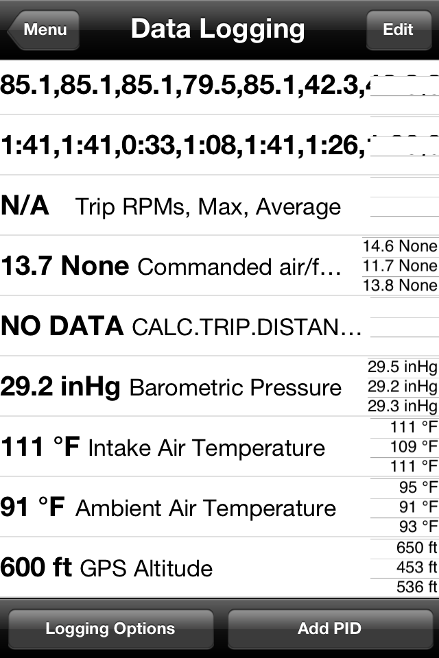 Ok, looking for some feedback as to what data to log. There is so much info that Dash Command can log that it makes ridiculously large files that are really not needed. There's a feature that's called persitent PID's and I'm turning that off so I can select the items to log. It should help reduce the size of the file. I think the rest of this tank will be used to get a feel for how the app works and by the next tank, I hope to have it down so I can log accurate info.