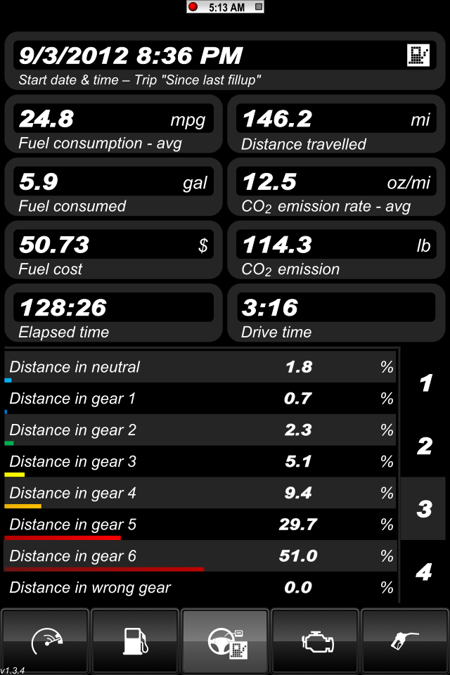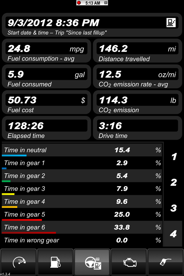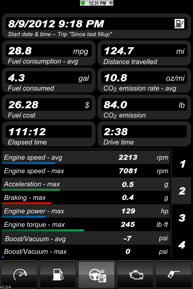 The trip meter showed 285.5 miles driven and it took 10.659 gallons for an average MPG of 26.78. The tank can be best compared to my 2nd and 3rd tanks recorded in Fuelly which were 25.18 and 25.96 respectively. Those were the two tanks that had more aggressive driving patterns. So it was still an improvement. http://i1132.photobucket.com/albums/...s/IMG_0566.jpg I was able to only log the last 124.7 miles of this tank due to the timing of my OBD II adapter coming in as well as the learning curve of the app. I lost about another 80-100 miles of data. http://i1132.photobucket.com/albums/...s/IMG_0559.png Here you can see the avg RPM and the Max RPM. http://i1132.photobucket.com/albums/...s/IMG_0560.png Here you can see the distance that I traveled in each gear. Disregard the MPG numbers here because they are not accurate. The number on the dash was 28.3, here shows 28.8 and the actual listed above was 26.78. http://i1132.photobucket.com/albums/...s/IMG_0561.png Here you can see the amount of time that I spent in each gear as well. A lot of time in neutral shows sitting at red lights or in traffic, etc. http://i1132.photobucket.com/albums/...s/IMG_0562.png Here you can see the altitude and barometric pressures. http://i1132.photobucket.com/albums/...s/IMG_0556.png I may be going to an Autocross this weekend so that will mess with the numbers a bit so what I am going to do is track it like normal and just fill up after the AutoX and monitor everything as usual again. I'm sure the tank with the autox will have terrible mileage readings. The first tank that I tracked with Fuelly was my last tank during the break in period so most of that driving was sub-4k rpms. I actually never changed my RPM warning beep so it's still set at 4k. I'll try driving the next full tank similar to the break in period one and keep it under 4k. I'm sure I'll cheat a little but hopefully not too much. :thumbsup: Ruskymx |