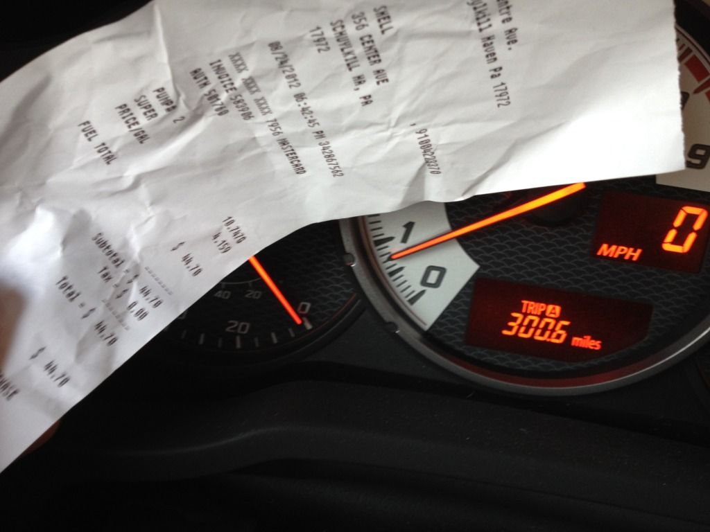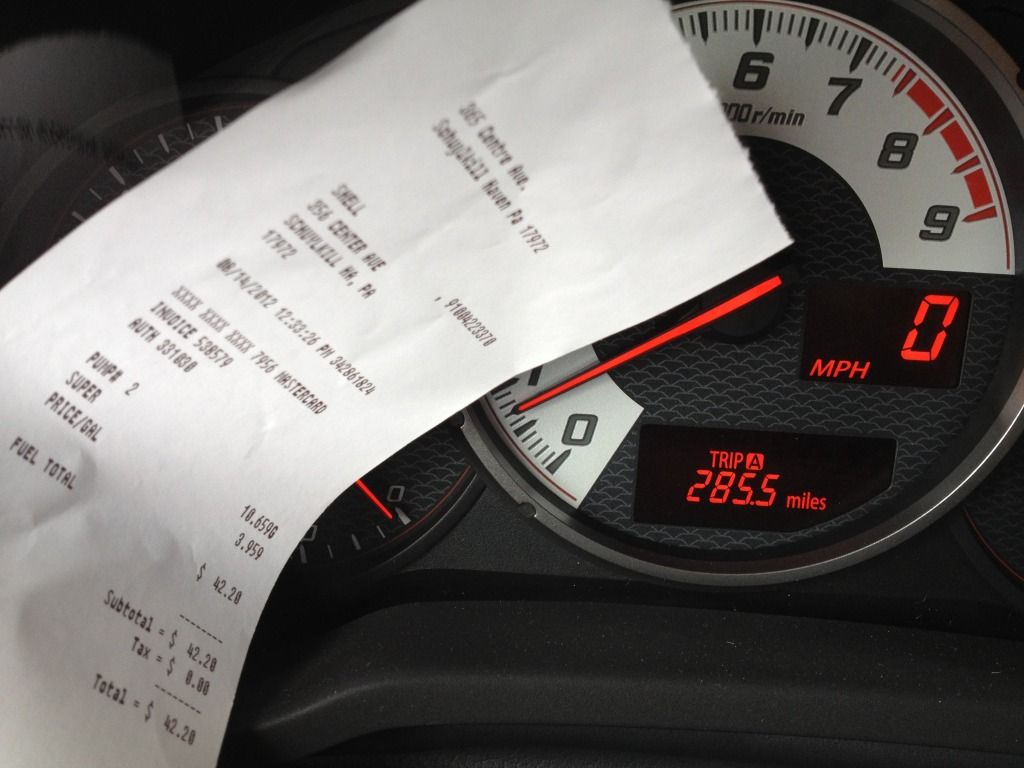 I just got back from the gas station and filled up with Shell V-power 93 octane like I have since I started my Fuelly account. The trip odometer had exactly 342.0 miles on it and I reset it at my last fill up. It took 11.110 gallons at $3.839 so this equals 30.78 MPG (FWIW, computer showed 30.5mpg). I had about 117 miles on this tank before the tune which included driving from Hamburg, PA to Edison, NJ for the tune. According to Google Maps, it was a distance of 100 miles even. I probably averaged 70-75mph while on I-78 & I-287, which was about 90 miles of the drive.