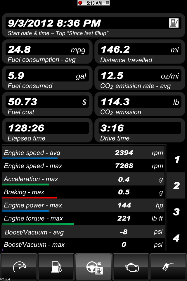 Top speed of 79mph but it wasn't via hard acceleration like the previous tank. http://i1132.photobucket.com/albums/...s/IMG_0575.png Max RPM of 5151. http://i1132.photobucket.com/albums/...s/IMG_0576.png I seemed to have gotten a lot more red lights this tank so it shows through the distance and time in the different gears. It also reflects in the time in neutral as well from sitting at red lights. http://i1132.photobucket.com/albums/...s/IMG_0577.png http://i1132.photobucket.com/albums/...s/IMG_0578.png The last two days have had cooler temps at night which is shown by these two pics from when I got back to my house and stopped in the driveway. http://i1132.photobucket.com/albums/...s/IMG_0579.png http://i1132.photobucket.com/albums/...s/IMG_0580.png This shows 30 mpg and the trip computer in the car shows 31.1 FWIW. http://i1132.photobucket.com/albums/...s/IMG_0581.png Here's the mileage on the trip meter. It shows slightly less than what the mileage shows in Dash Command in the pic above. The discrepancy comes from the app shutting down when I receive a call and the bluetooth picks up. I made the mistake of logging this with my iPhone instead of my iPad. Next tank, I will log it with my iPad so it should be very close. http://i1132.photobucket.com/albums/...s/IMG_0582.jpg I am thinking about filling up before I go to the AutoX tomorrow because it will affect the mileage severely I think. I don't really care if having a full tank means extra weight because I am not going to win, but just to have fun and learn the characteristics of the car. Ruskymx |