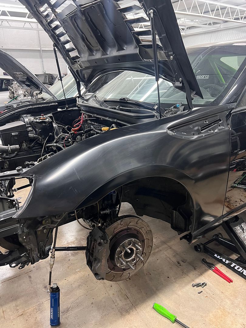 We are moving shop locations soon which means this thing needs to be a roller again! We have the shocks back from getting rebuilt and they are going on the car. :D There was a bent rod end on one of the SPL Lower control arms as well so that has gotten replaced as well as we put the car back together. https://hosting.photobucket.com/imag...QnSAqaE2Zu.jpg https://hosting.photobucket.com/imag.../IMG_5178.HEIC The lack of finished hood vents was bothering me and the wrap guy said it is easier for him to do the wrap around them installed, so they are officially bolted on. Really very happy with the customer service and quality of the parts from Racelouvers. Highly recommend. I was able to send Al the measurements of my old vents and he was able to get me a template to test fit his parts to make sure they fit within that spacing with minimal extra cutting and I get to reuse my same hood which is a nice cost savings. My OCD on looks also loves that he sends black rivets with the kit. https://hosting.photobucket.com/imag...tRoT2gLdkM.jpg The car also had a bit of damage on the Left fender that while I'm at it before the car gets wrapped later this year I wanted fixed, so that fender also got replaced. https://hosting.photobucket.com/imag.../IMG_5180.HEIC And the newest project is now cleaning up the rest of the trunk. Removed the coolshirt and old fire bottle, and decided while we're at it to do a little more. The fire wall annoyingly blocks access to the rear strut chassis-mounting location. So, we have removed those corners of the firewall that were riveted in place and going to nut-sert them for easier future removal. https://hosting.photobucket.com/imag.../IMG_5175.HEIC It's a bit messy back here right now as the fuel system likely also needs a refresh, so the plan is to get a fresh fuel pump and then reinstall everything. The coolshirt bracket and fire bottle brackets are out and will plan on painting everything back here in the trunk as well to clean it up. https://hosting.photobucket.com/imag.../IMG_5176.HEIC Motor install probably on hold for a while longer, but glad to get some of this ancillary stuff going and I'll pick away at more cleanup in June. |