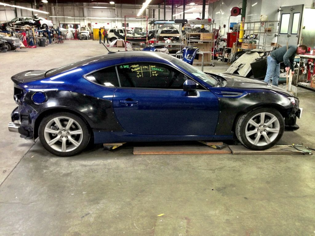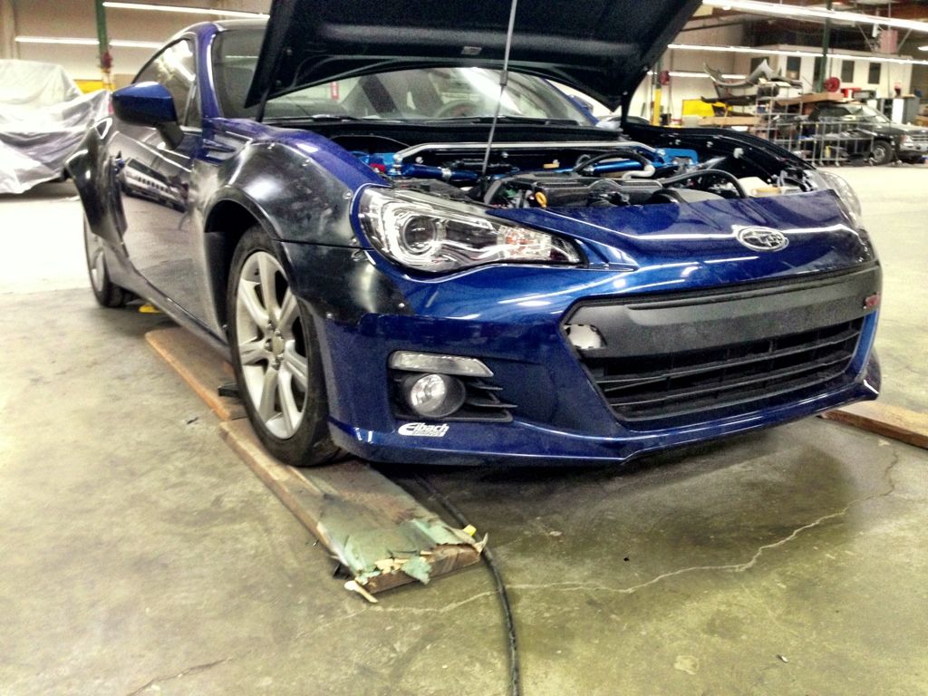 Anyways, They've started the body work. Checked in today and it's mostly just seeing how it's all going to fit on. They took the bumpers off and are measuring where to cut. Also, as for personal preference, I've decided against using the front lip and side skirts. I don't like them. The lip is okay, but to me the side skirts look like a tacked on after thought. Going to go with either STI or seibon TA style skirts. Same with the lip. Either STI or TA style. |
