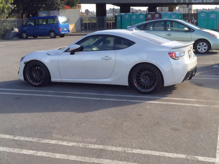 Enkei RS05RR Silver 18x8.5 +42 front and 18x9.5 +43 rear on Yokohama AD08R 225/40/18 and 235/40/18. + Eibach Pro-kit lower springs that drop 1 inch all around. No rubbering or any problems at all. The ride is a little bit firmer than before, which is very nice !!!. The image quality isn't that good since I used my iPhone4s to take all the pics. For much more better image quality check out my Member Journals. http://www.ft86club.com/forums/showthread.php?t=57212 |