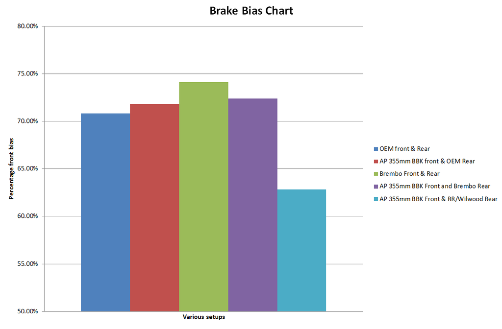 We haven't had a chance to do the calculations on their rear kits yet, but hopefully soon. As you can see though, any talk of our Essex/AP kits being more front biased are untrue. The opposite is in fact true. Thanks. % of front brake: Stock 67.1 Essex Sprint 66.3 Essex Endurance 68.5 RR Sport Performance 72.9 RR Stage 1 69.4 RR Stage 2 69.4 RR Stage 3 69.6 RR Stage 4 69.6 |