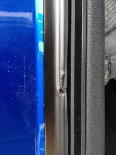 Did they take anything? Or was it just random violence? Where were you parked? By bump in the door, do you mean that dent in the window molding? You can probably replace that entire plastic molding with a new part from dealership. Good luck with your repairs |