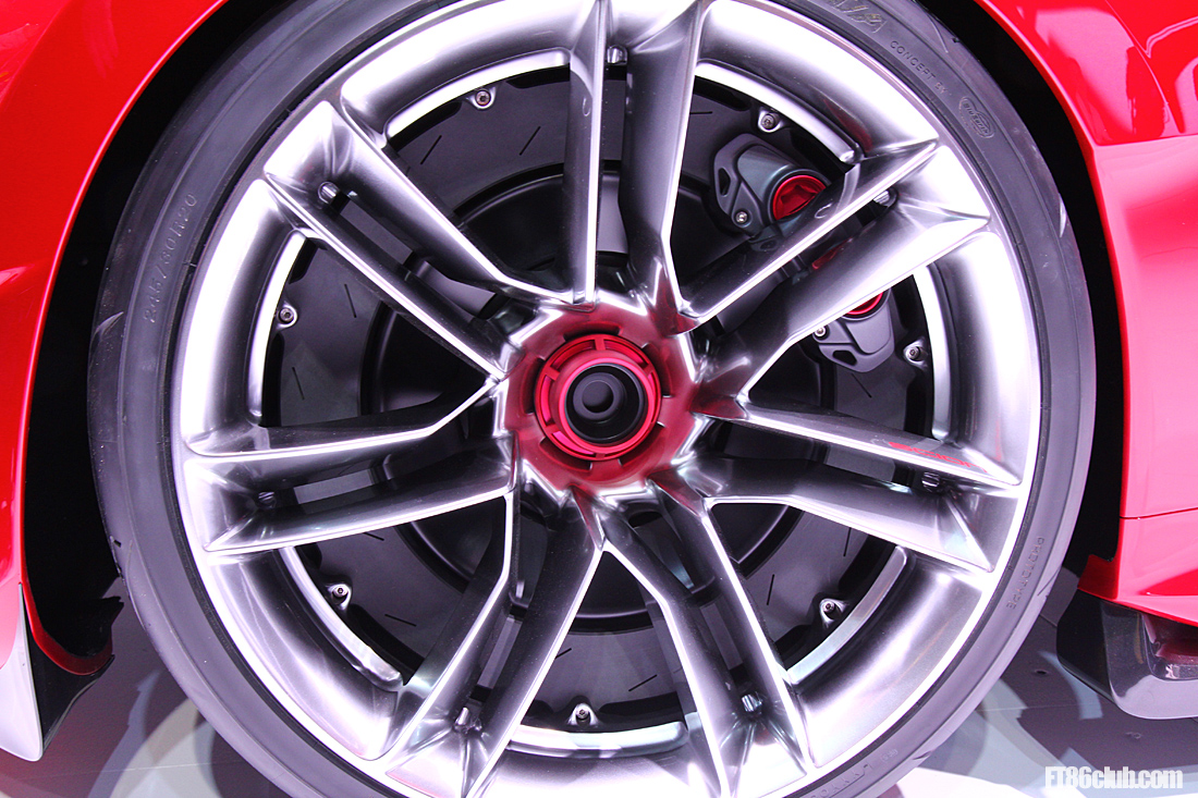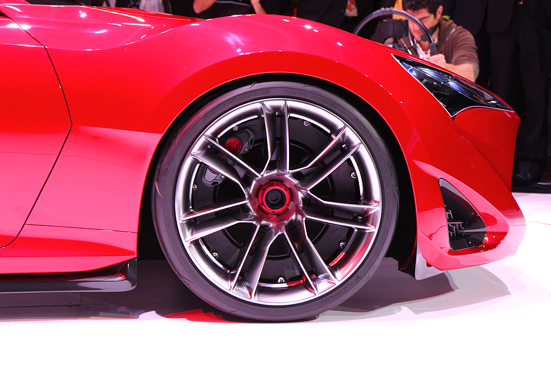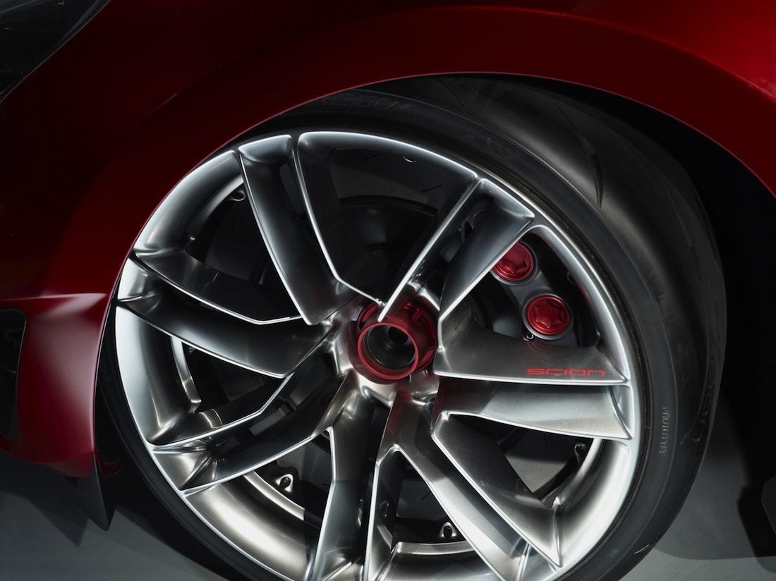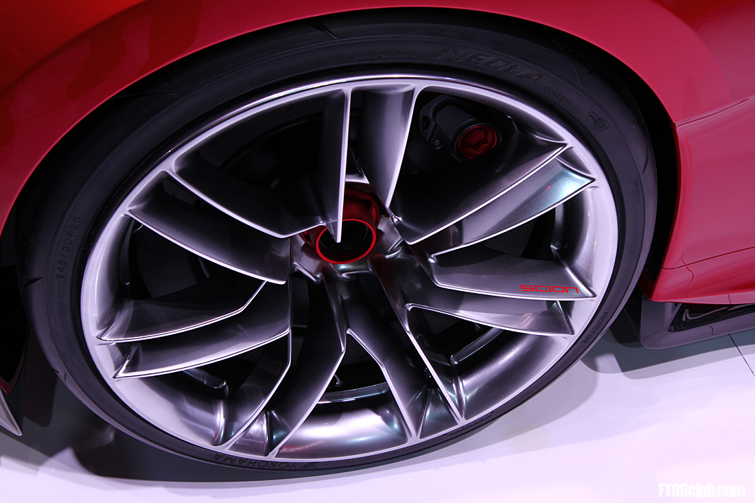 The FR-S Concept connects to the road via 20-inch wheels that are staggered… 8-inches wide up front and a ridiculous 10-inches wide in the rear. The wheels have a unique motorcycle-style braking system with huge 18-inch rotors that are attached to the wheels. Four-piston calipers bite down hard when the car needs to be brought to a halt.