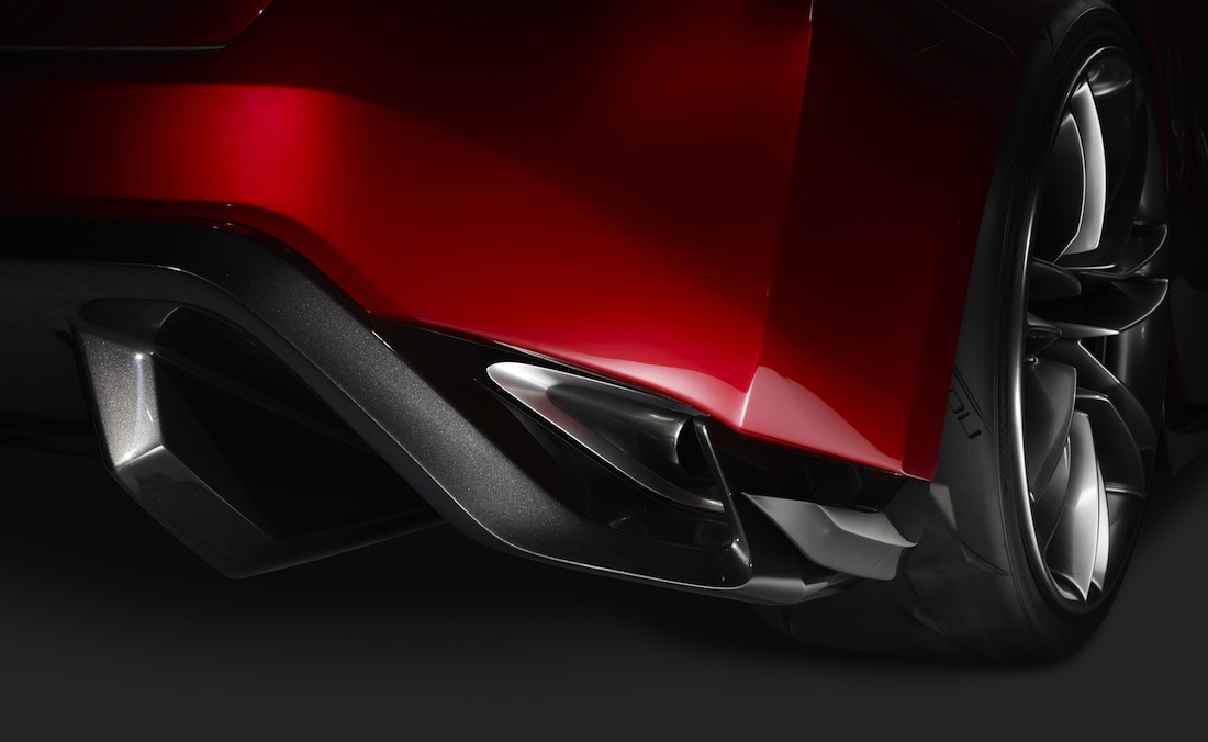The front bumper is aggressive… with fierce… edgy headlights. The roof has a gull-wing shape… channeling air-flow smoothly over the car. While the rear features a trapezoidal shape with unique tail lamps and center-positioned back-up light.