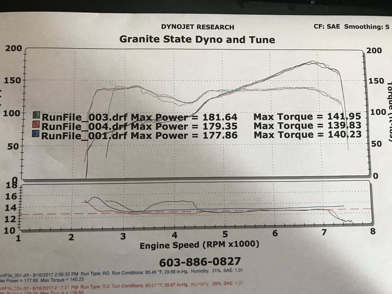 As many of you know I have been working on getting my car to the dyno to get a baseline before I started to do mods to it, and in that time I got the OFT and decided it would be a great chance to see if the stage 1 does anything so with out further wait here are the results with explanation below: Attachment 157183 So run number 1 is with the bone stock car on the bone stock tune. It made 177HP and 140TQ. There was a run number 2 also on the bone stock tune, but was in 4th gear to see if that would do better than 5th or not, it only made about 171HP so he stuck with 5th. Run 3 was the first with the OFT Stage 1. He was light on the throttle at the begining of the pull to make sure it wasn't going to pull timing because of just flashing it (we did let it idle for about 2 minutes and went up through the range slowly). Here we see a peak of 181HP and 141TQ. Run 2 is the green line and has the worst dip because he wasn't full on the throttle (take a look at AFR ). Then finally we had another OFT pull that made 179HP and 139TQ on run 4. Run 4 is the Red line. The main point of today was just to get a baseline before I started modding, I knew the stage 1 wouldn't make uber amounts of power, but I was hoping for something in the dip area, as we can can it made maybe 1-2 ft-lbs at the 3500-4000 range and again from 5000 to 7000. I had forgotten to log the stock pulls, but here is the log for run 3: http://datazap.me/u/jermmx5/2017-toy...53&tmax=231.40 And here is run 4: http://datazap.me/u/jermmx5/2017-toy...20&tmax=291.21 Overall I'm happy that the OFT game me 2-4 HP up top. And on the dyno, the commanded AFR and the actual AFR actual look really close compared to when I log on the road in 3rd the commanded being 12.12 and the actual being 11.02. |