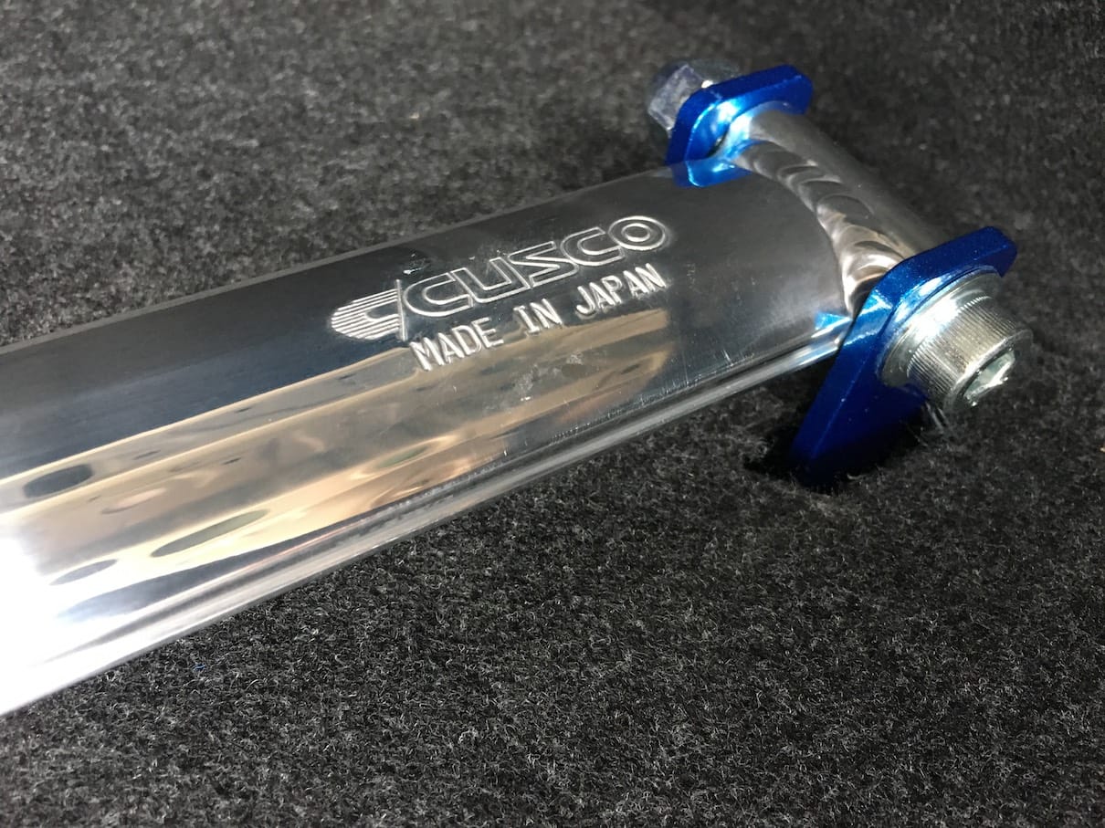 First round of parts arrived today. I went ahead and got the K&N air filter and the Cusco front and rear strut bars installed. I was doing most of this after dark, so not only are the pictures below a bit lacking in lighting, but I didn't quite have the time/energy to do the Shrader rear seat delete kit install tonight too. I'll probably do that this weekend if I don't get a bee in my bonnet before then.