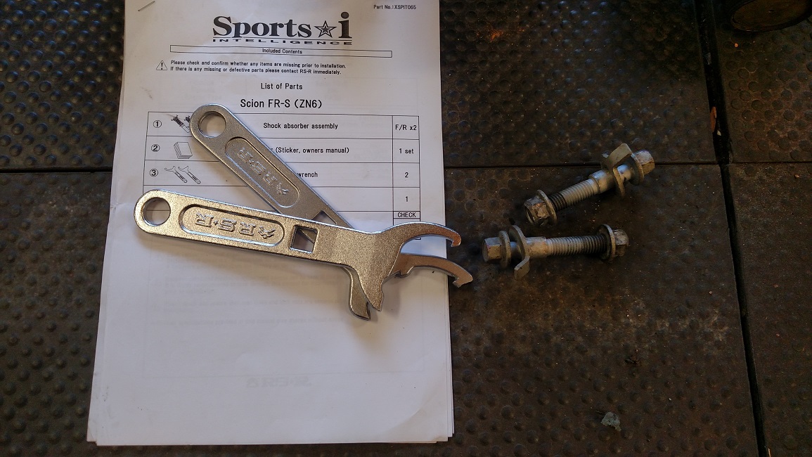 Here are my coilovers off my FR-S. Used for about 10k and a great dualpurpose coilover. The top bearings are still free with no binding for the front coilovers. Owners manual and adjustment wrenches included. I can also include 2 camber bolts for front alignment