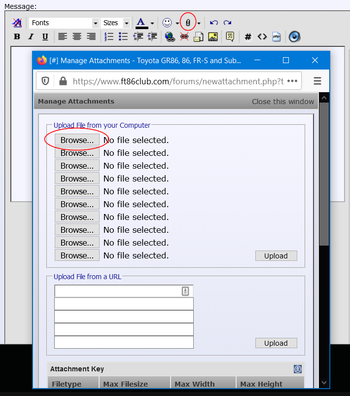 OK, I figured it out with the advice. But I didn't have an 'upload' button in attachments at first which is why I tried to go with copied URL's. It turned out to be a settings change on my computer ungrayed the Upload button.
