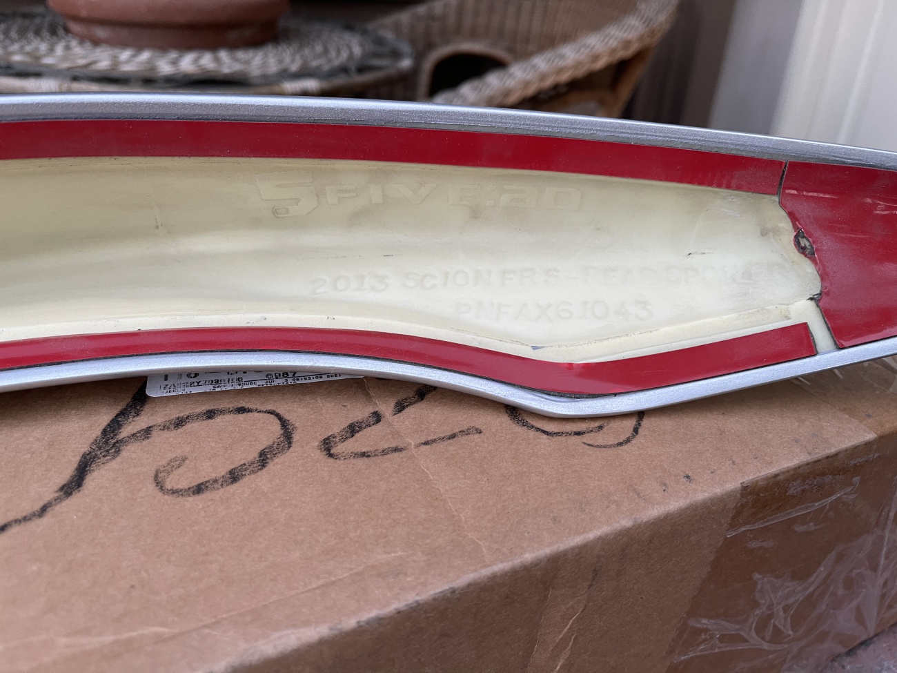 Selling my 5FIVE: ad rear lip spoiler. Works on BRZ/FRS/GT86. Went with a different route instead so no longer needed. Never used, adhesive is ready to go. Color code is: #G1U. Willing to ship or local pick up. $270 O.B.O.