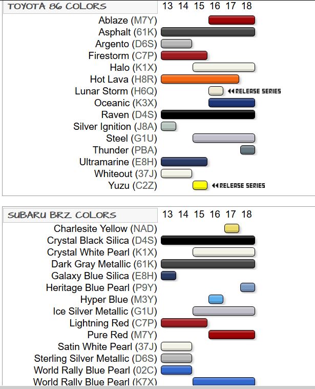 FRS/86 2013 10 series = Silver ignition, the cool silver that can look brownish/greyish/silver depending on light. 2015 RS 1.0 = Yellow 2016 RS2.0 = Lunar Storm....kind of a weird beige/green/white 2018 = Thunder, some oddball blue/grey 2020 Hakone = The green I think the BRZ only got the thunder grey equivalent, the pastelish blue (not the same as the neptue blue i dont think), and the yellow. all part of a BRZ series of some kind (in the US it was a Series.<colour>, In Canada they had BRZ Special edition names like Aozora (blue(?), Inazuma (yellow), Raiu (thunder grey) Gen 2 has the anniversary orange as its special colour so far....i dont think the BRZ got anything though. |
