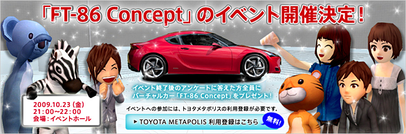 Mark your calendars! Toyota has announced that the Toyota FT-86 Concept will be unveiled at the Toyota Metapolis site on October 23, 2009, a day before the general public viewing dates start at the Tokyo Motor Show!