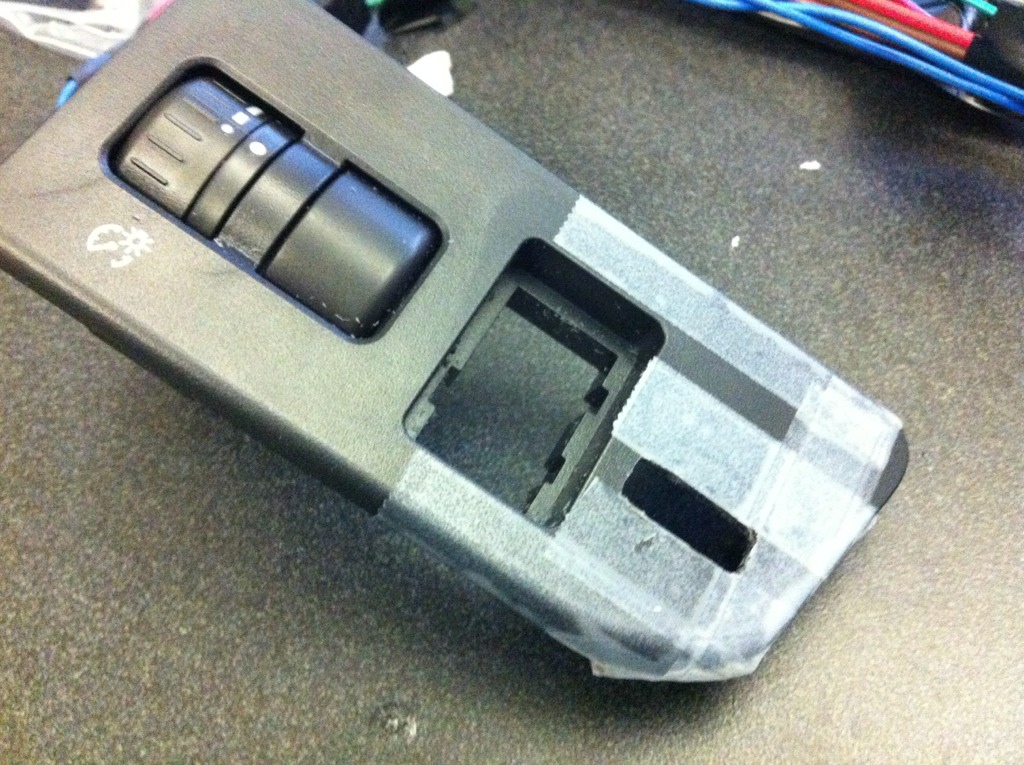 I'll be installing two rocker switches in the whatever-it's-called panel. It will look way nicer and cleaner than having the switches or a separate boxed taped on underneath. What you see below is the lower hole.
