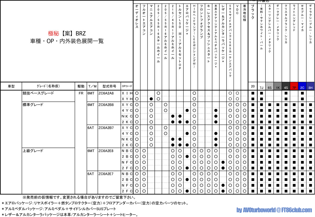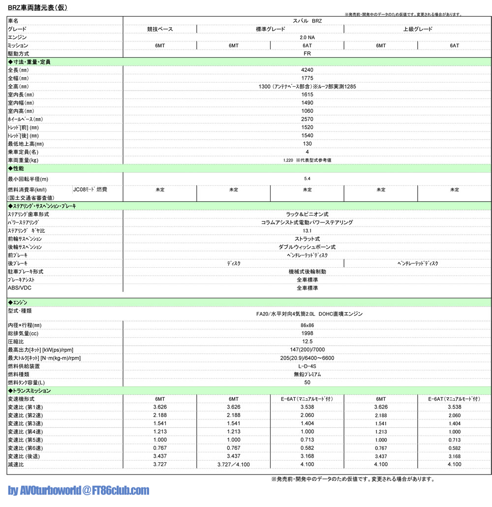 Curb weight for automatic with 17" wheels, upgraded 16" brakes, aluminum foot rest and pedals, stainless steel door sill covers, spoiler, "floor and under tank cover" (what is this...?), 2 speaker system, is 1220kg, it seems. Base model does not have any of these, along with no trunk light/trim, no vanity mirror, no er, I assume that's soft touch cover over the dash or something. Hmmm...the base looks pretty good :D I didn't think it would be missing speakers, but hey, I guess cellphone speakers are pretty loud these days. EDIT: Thanks for the pricing info, AVOturboworld. Then I guess the STI might come in around the price of a WRX maybe when it comes out? |