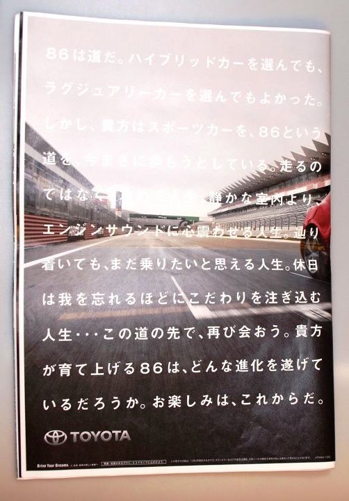 They could have placed ads like "This beast has 500hp! and 500ftlb tq and world class AWD, YOU WILL NEVER SHIT YOUR PANTS EVER AGAIN FOR ANY CAR!" no, they gave us an abstract image of an emotion a feeling. Car companies don't do this..they sell cars...not feelings. So it doesnt matter that this car only has 200hp or sports a boxer engine or has a low CoG. none of that matters. What matters is the FRS/BRZ/GT86 is going to take us on a journey that very few people now days experience, or can even remember it from the old days. Thanks Subaru, Thanks Toyota |