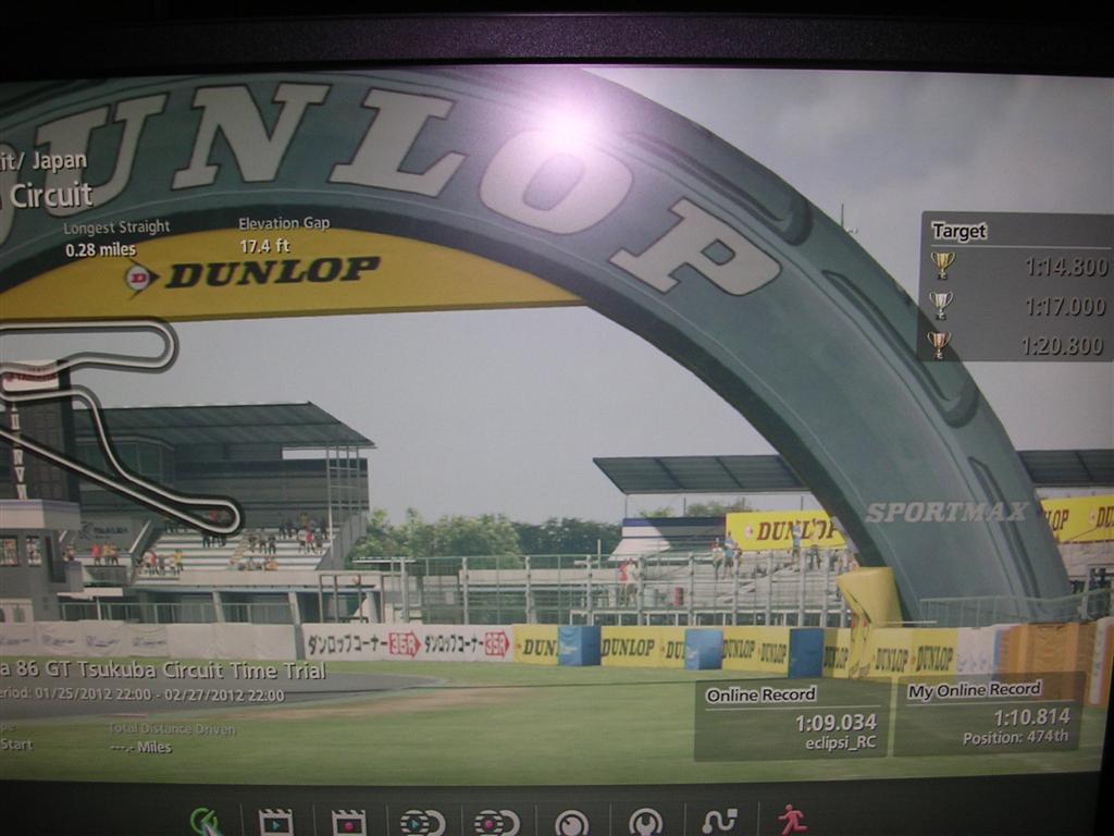 Well, I've been attempting it tonight with a few different set-ups and I just can't seem to break under 1:13. I was just driving my fully tuned 86 GT and managed to edge down to 1:13.008. I haven't messed much with the camber and toe in the suspension on that car, just lowered it and stiffened the springs, dropped a level of anti-roll bar. I've changed the set-up now, but I'm sore from driving for so long, so I'm going to give it a rest and try again tomorrow! I also only have the 6-speed close-ratio transmission in the car, the fully-customizable confuses me too much, I'm not sure where to set it. :(