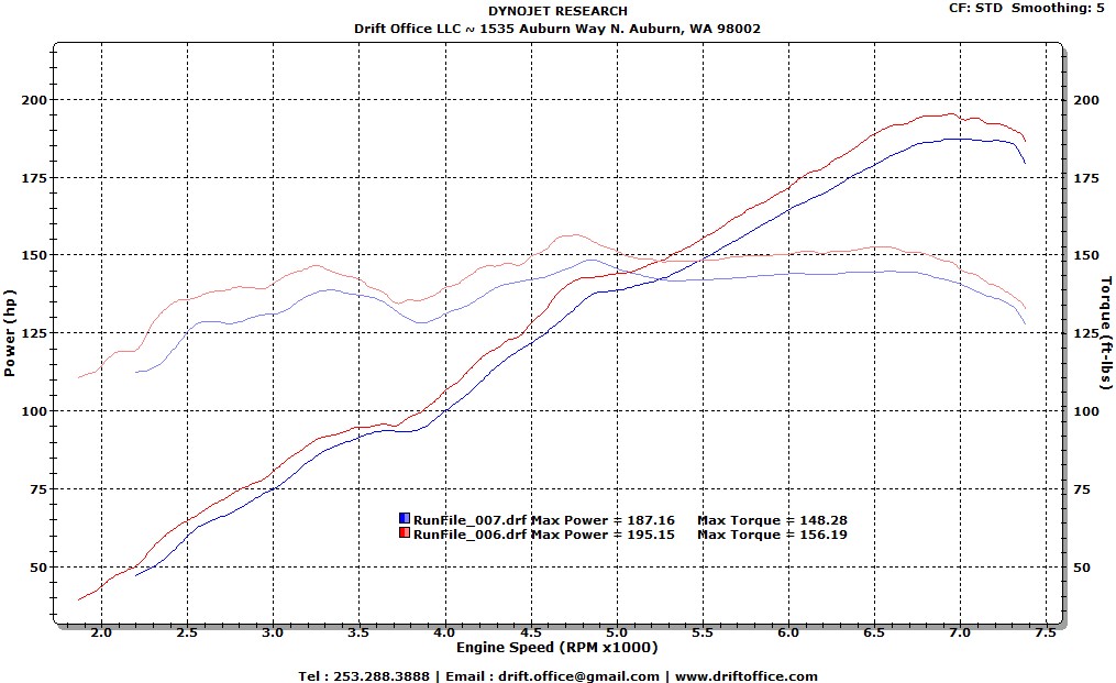 His current setup : Takeda Intake HKS Equal Length Header Motive Front Pipe Perrin 2.5 Inch Overpipe and Exhaust Jumping straight to the results, here are his 3rd & 4th gear pulls respectively, each sampled before and after the tune... Attachment 43943 Attachment 43944 Attachment 43945 Not bad ~ a few HP shy of the magical 200WHP, but there were a two factors that had contributed to that ~ HEAT and secondly, MAF turbulence caused by the intake. In the many, many FRS / BRZ setups that have come and gone thru my facility, I have noticed that you would be hard pressed to get a better intake than the stock. Granted that it doesn't look bling enough for most, it really does well when it comes down to it, especially if you're planning to tune it down the road. That said, I'd like to think that we did a pretty good job here given the minor complications and yielded highly positive results. So here's what a 100% stock setup vs this HKS setup looks like... Attachment 43949 And for those who are undeniably going to ask...what does this look like against the BORLA setup? You decide... Attachment 43950 Ref: http://www.ft86club.com/forums/showthread.php?t=37225 Video to come later tonight for those interested in what an EL setup sounds like with a Perrin exhaust... Cheers! Bob @ Drift-Office, LLC |
