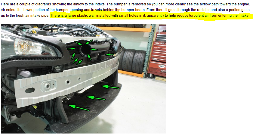 Looking through Perrin's blog on the airflow, you'll see in the image below of how air is processed through the front-end. Question came to mind, why is it that we wouldn't want turbulent air from entering the intake. If you had a CAI, the filter will rest where the holes in the plastic wall is, allowing for less restrictive air flow. Attachment 54969 If airflow comes in from the bottom of the radiator up, out through the wall with holes, why couldn't we dremel out this opening for more airflow? This all kinda started when I was looking at replacing the front crash foam with the BeatRush Front Beam Bar. Cleans up the front bumper, and could potentially allow for an air scoop. On my BMW, RPI developed an air scoop that would mount behind the front grill. This scoop would force air straight into the airbox when driving at normal speeds. I thought of an idea to create a similar scoop that'd start from the bottom of the bumper, upwards to the plastic wall with holes. See below for what I mean... Attachment 54970 Would any manufacturer be interested in this concept? @PERRIN_Mladen @Mishimoto I'll try to mock up a design out of sheet-metal so you all can have an idea of what I mean. .ck |