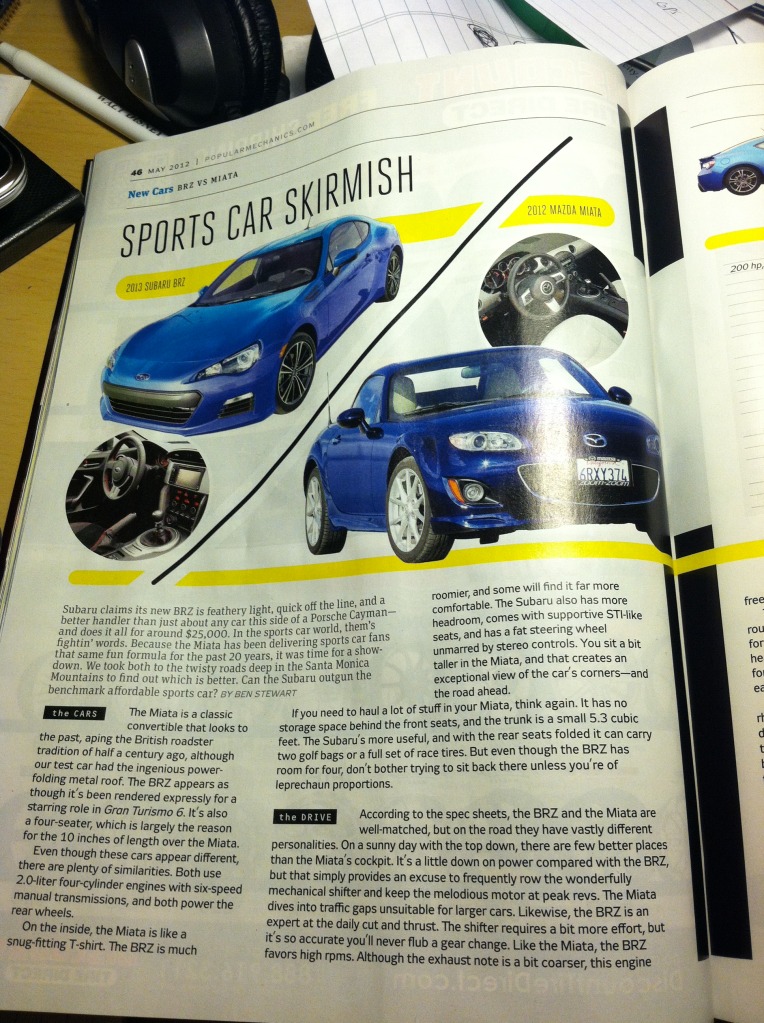 BRZ vs Miata (Popular Mechanics May 2012)