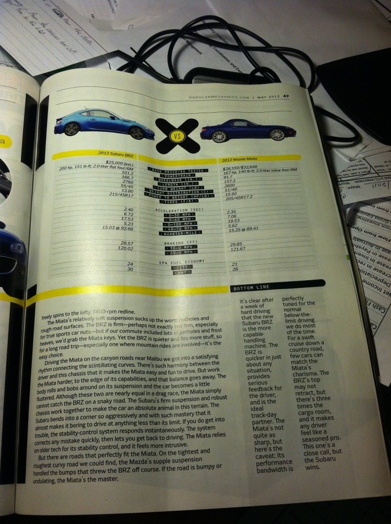 Surprising from Popular Mechanics - am I having a brain fart, or is it them? On topic, out of my previous cars, the PRHT MX-5 was the one I miss the most. I thought I was moving "up" to a Cayman. Even though the Cayman is a wonderful place to be, it never felt like I could toss it around as much as the Miata (especially at sane speeds). I guess at Porsche prices, I didn't feel as comfortable driving it hard, either. I'd get a Miata again, but I have a kid to stow on rare occasions, now, so I can't go back to a 2 seater. So, these comparos for BRZ to Miata are perfect for me! They're giving me confidence I'm doing the right thing, even though I'm buying without having driven the car yet (and only seen one in person for 10 minutes). |
