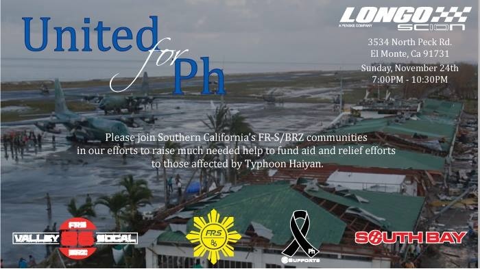 This is not your ordinary car meet. It's a car meet for a cause. With the recent disaster that has struck the Philippines, the Southern California FR-S/BRZ community felt the need to do something and raise funds to help those affected by Typhoon Haiyan. Please join us on Sunday, November 24, 2013, 7:00pm-10:00pm, at Longo Toyota (3534 N Peck Rd, El Monte, CA 91731) and make a difference. This is open not only to FR-S and BRZ enthusiasts but to everyone who is willing to support our cause! Please share and spread the word. See you all there!