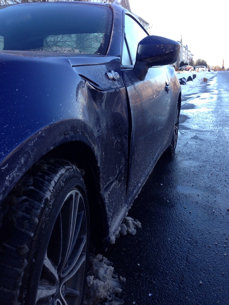 Fender, door edge is bent inwards, plastics, and unfortunately the wheel was not turned to the side when I parked her this morning. To prevent badness I just went inside for coffee before the full assessment.