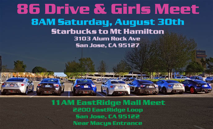 If not April 19th, I'll meet up with you girls on the next event! If April 19th, Location vote is #1 San Jose / Santa Clara #2 Milpitas Black Angus hehe #3 Fremont Automall Parkway or Pacific Commons Thanks for the coordination BRZkitty! |