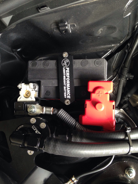 4/2/14 Tomioka Racing lightweight battery with aluminum mount added. Nice addition to give my catch can a little more breathing room