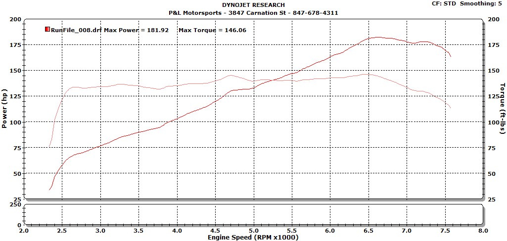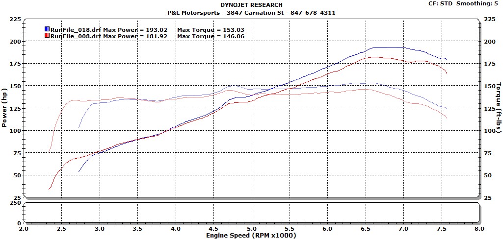Mod List: K&N Air Intake - $281.00 Borla UEL Headers - $510.00 DC Sports Test Pipe - $140.00 Invidia Q300 TI Cat-back Exhaust - $745.50 Total cost after tax and all had free shipping - $1,676.50 Tuned by: P&L Motorsports "Home of the worlds fastest Subarus" - $1,100.00 Tuned on both 93 octane and E85 Total cost of parts and tune - $2776.50 On the Dyno Attachment 71400 E85 Results Attachment 71403 93 Results Attachment 71401 Both Results Overlaid Attachment 71402 Gained 43.02 rwhp on E85 Gained 31.92 rwhp on 93 Octane Doesn't sound like much but it is very noticeable and makes the car a lot more fun to drive. Hope you guys enjoyed this and if you have any questions feel free to ask. |