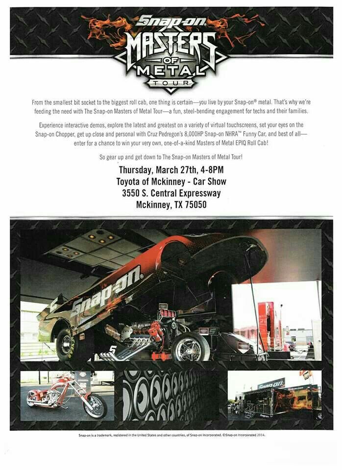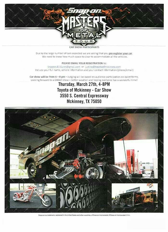 WHO: all who can attend WHAT: Monsters of Metal meet WHEN: Thurday, March 27th 4 - 8pm WHERE: Pat Lobb Toyota of McKinney, 3350 S Central Expressway, McKinney, TX WHY: Cause it'll be fun, CHEAP FOOD @McKinney FRS I will stop by the dealer tomorrow for some more info to post on here or you can also post (This is your event, I'm just trying to spread the word around) If you can attend, let me know. Sent from my SGH-M919 using Tapatalk |