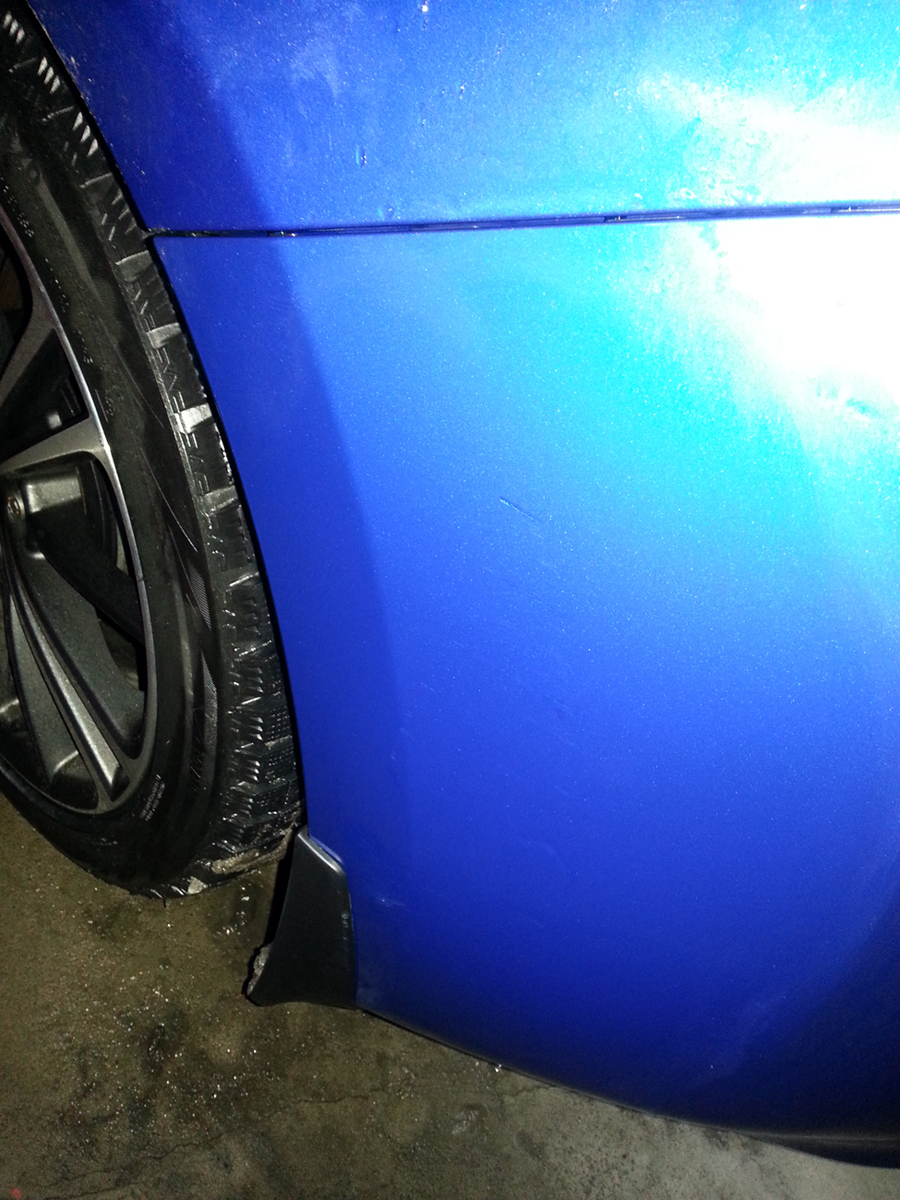 I had the car for less than a week, then some lady grazed my bumper. Here's the damage: http://i.imgur.com/oF6P7JJ.jpg I know. It's not that bad. Most of it will buff out, I'm sure. Assuming insurance pays out, how would you guys go about it? Replace entire bumper? Or buff, touch-up and pocket the money for other things? I could also ask a body shop I know to touch it up for me their way. I did see a DIY about some guy repairing a scratch on his FR-S by sanding and painting it. I'll install my own mods, but I'm too squeamish for that. EDIT: they're still waiting on the lady to give her statement... ugh. I haven't had the insurance adjuster quote me yet, but the body shop told me around $700. |