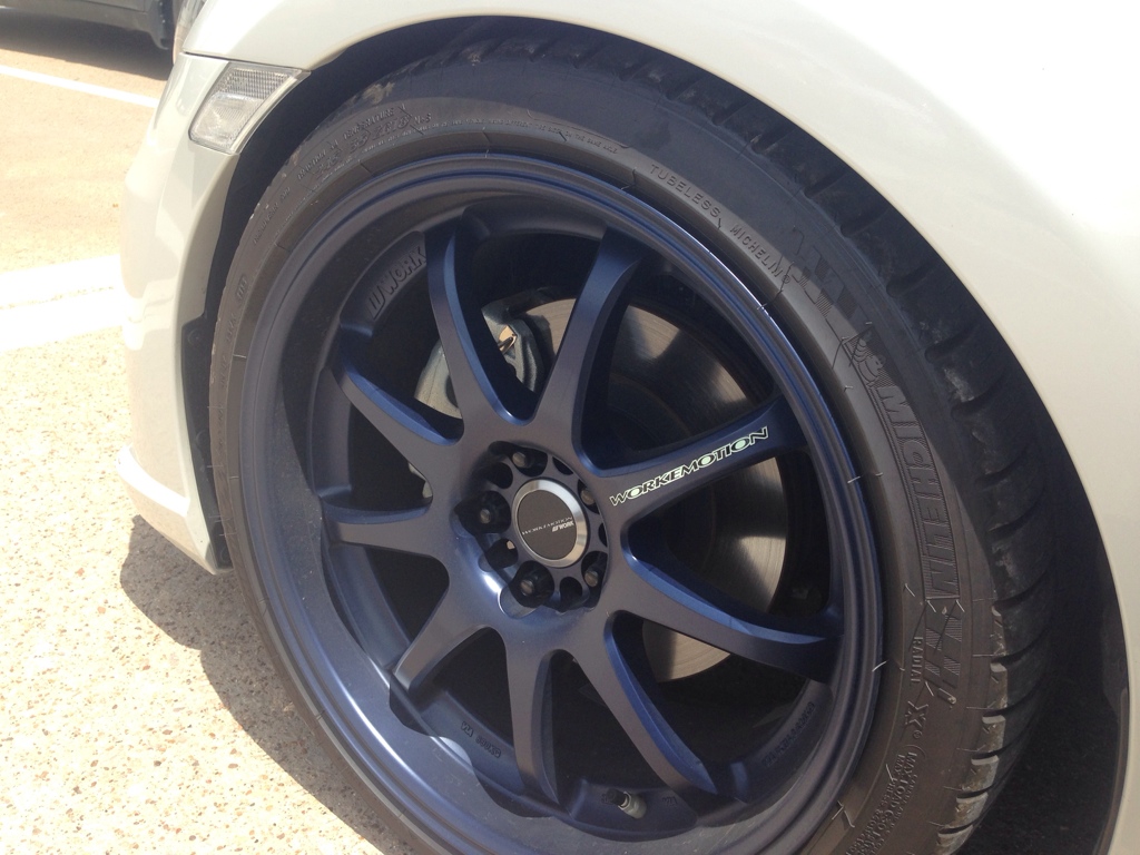 I am selling my Limited Edition Matte Blue Work XD9's. They are 18x9 +38 for the fronts and 18x10 +38 for the rears. They will come with the work center caps, hubcentric rings, work valve stems, and black spline lugnuts. The tires are Michelin Pilot Sport A/S 3. The front tires are 245/35/18 and the rears are 265/35/18. I have about 5K miles on them. I had to roll my fenders a bit so I wouldn't rub. Depends on the drop you're going for. I have about a 3/4 inch drop on mine. Wheels have no curb rash.