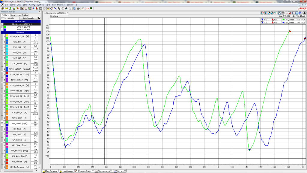 3. We brake almost same amount, except that he peaks and feathers off, while I roll on to the brake, however our time spent braking is identical! And because of this I carry more speed through the initial corner. More on this later.