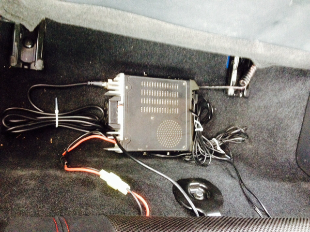 Attachment 94791 The advantage of this and some other ham radios is the head can be removed and used remotely from the radio itself. I have a separation kit and for now I used double stick tape to put the controls on the center console. I have a gooseneck mount on the way, which will attach to a seat bolt and will let me position the radio controls anywhere I want. For the mic I use that Velcro type stuff used for toll transponders (Radio Shack carries it). The mic sits where the heated seat controls would go if I had them. Attachment 94792 The guts of the radio itself sit on the floor under/behind the driver's seat. I noticed the floor mats Velcro to the carpet, so I used Velcro to stick the radio down. Plus, my seating position is most of the way back, covering the radio (it has a built-in fan to keep it cool when I'm talking a lot on high power). The remote head, mic, power straight from the battery, external speaker (I wouldn't hear the built-in one under my butt :) ) and antenna coax all plug in here. Attachment 94793 I picked up an adjustable trunk lip NMO antenna mount. I'm able to tilt it in so the antenna doesn't point off to the side, but with only one axis of adjustment it still leans back a lot. I didn't feel like dropping $50 more on a more adjustable mount to get it perfectly vertical. The antenna is a Comet tribander (144/220/440 MHz) I saved from my last car. Attachment 94794 I mounted it far back on the trunk lid. Though more forward might be better theoretically, this way the antenna never bangs into the roof, and doesn't scratch the paint. And that's it! My radio can run up to 45 watts, but I don't need more than 10 to hit my local repeaters reliably, despite the compromises I made in the antenna installation. Even 5 watts would work, but 10 is more reliable. Lessons that could apply to CB - Larsen makes an NMO mount antenna that would work on CB frequencies, and you could mount it the same way I did. A handheld radio running off the lighter might work best, given the challenges of mounting a mobile radio in this car. Remote heads aren't common in CBs that I'm aware of. Or you could just get your ham license and use better radios with better range. :) |