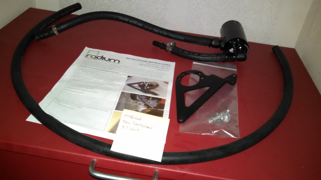 Radium Engineering Catch Can kit specific to our BRZ/FR-S. Comes with everything you need to install and even extra hose just in case. I realized that I'm not catching anything on the crankcase side of things so I'm selling this. I have mine mounted opposite as I have the Innovate supercharger, because the hose was a little shorter this way. For the non-Innovate supercharger people this is the PCV Valve kit (or Innovate that use a little longer hose), which is where I'm catching quite a bit of oil/spend fuel. Selling the kit for $180 (cost $220 plus s/h on Radium's site). This is great for not only the track enthusiasts but enthusiastic street drivers as well. It prolongs the life of the engine by not allowing re-circulation of unspent fuel/oil which slowly damages the engine.