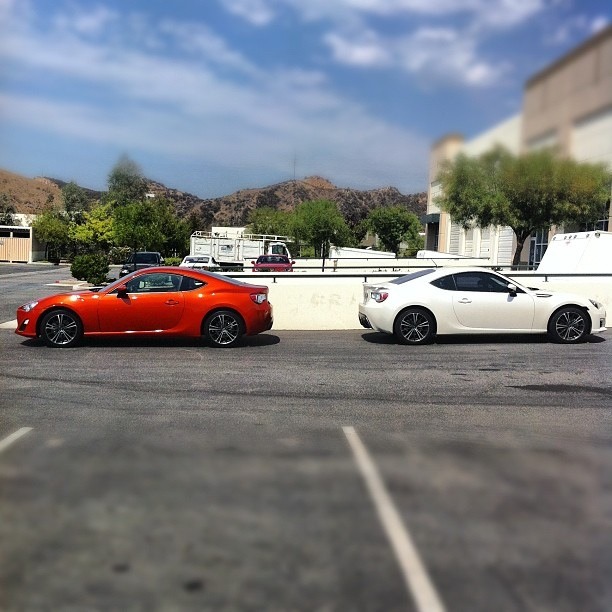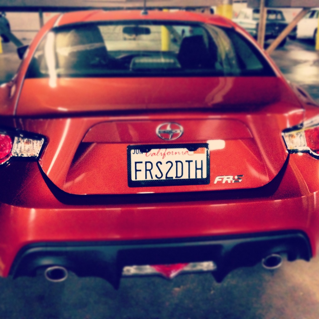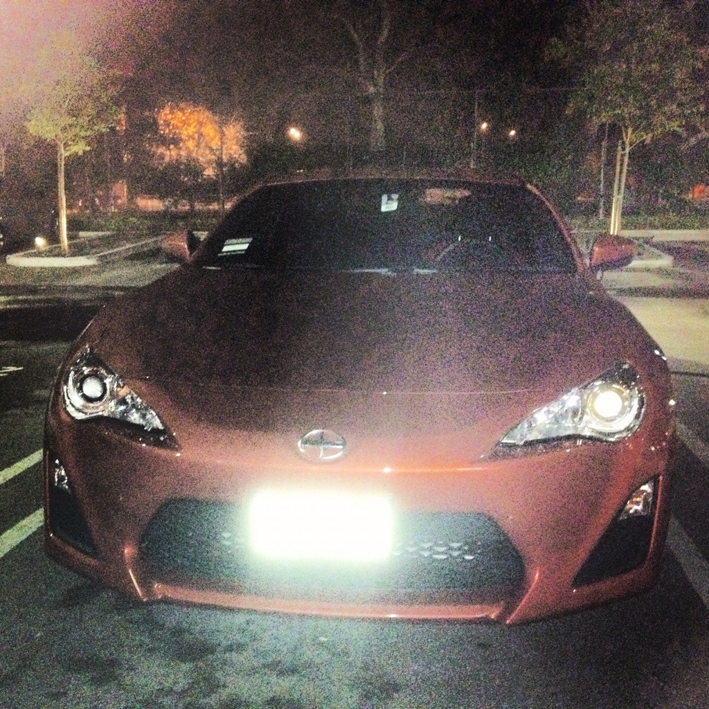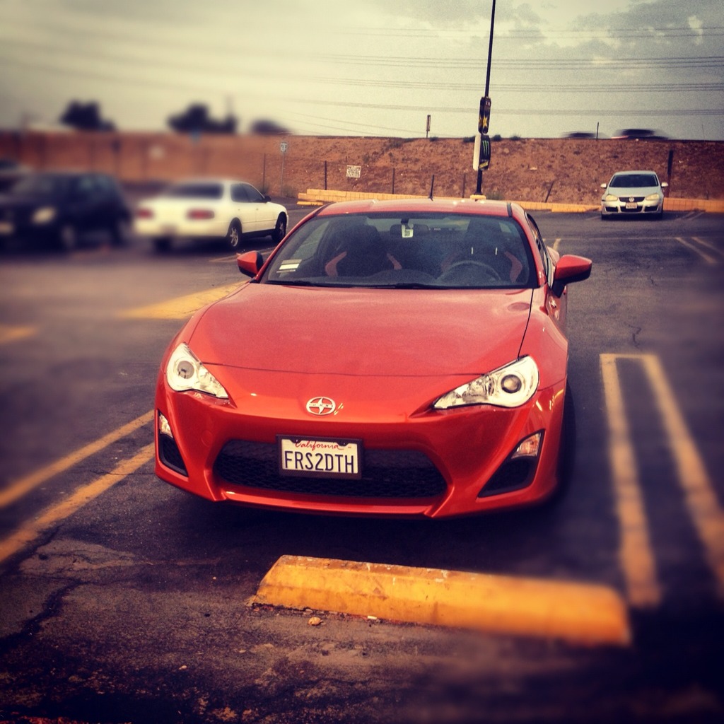 Sorry been busy this is the only picture ive been able to snap, while i was making them clean the glue left on from the plastic. Haha one of those guys was trying to park it for me, and he didn't realize you had to pull up on the stick shift to get it to go into reverse. He also didn't realize i was watching from the office window cracking up cuz i knew exactly what was going on when he wasnt going into reverse and kept inching closer to a 4runner. I have gotten to drive it quite a bit however, i've almost put 100 miles on it today. So much fun! It's been a big adjustment from my old car a Nissan Sentra SER Spec V. But all in great ways, the nissan was a fun econobox with a little extra power. You can really feel that the FRS was built for much greater things. My evening drive through downtown go cut short however, i was very dissapointed. Detours were fun too though. Hell parking is fun in this car. I still haven't had much of a chance to play around with much of the interior do-dads. Just paired up my cellphone to it. Great day, now to look up what i can get locally and what i need to talk to Carson Toyota about. |