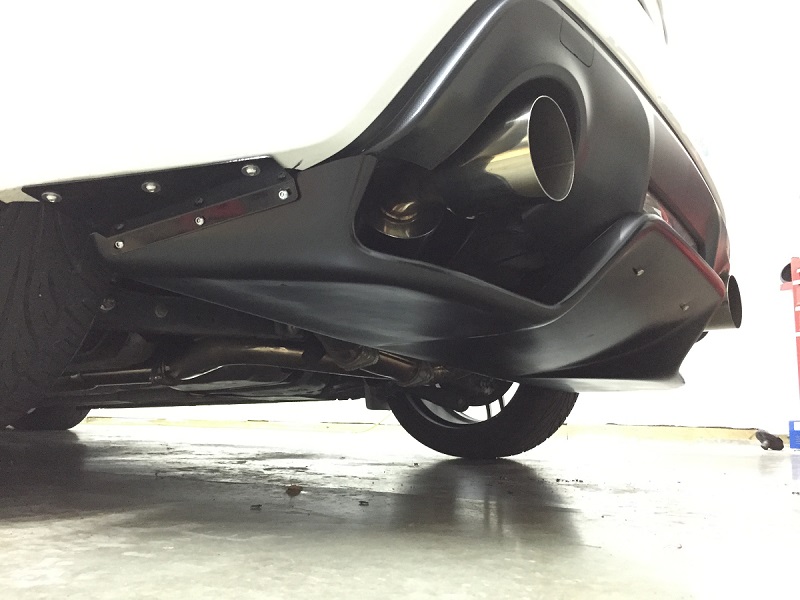 We have not done any wind tunnel testing and chances are we probably wont, so the facts will all remain theory based but anytime you can redirect air from being caught in the rear bumper you are reducing drag. The stock muffler on the car did an ok job of this but with most people on here running a/m systems it allows alot more resistance in the rear of the car. it will be awhile before we find any downforce numbers as right now we are still working on production details. |