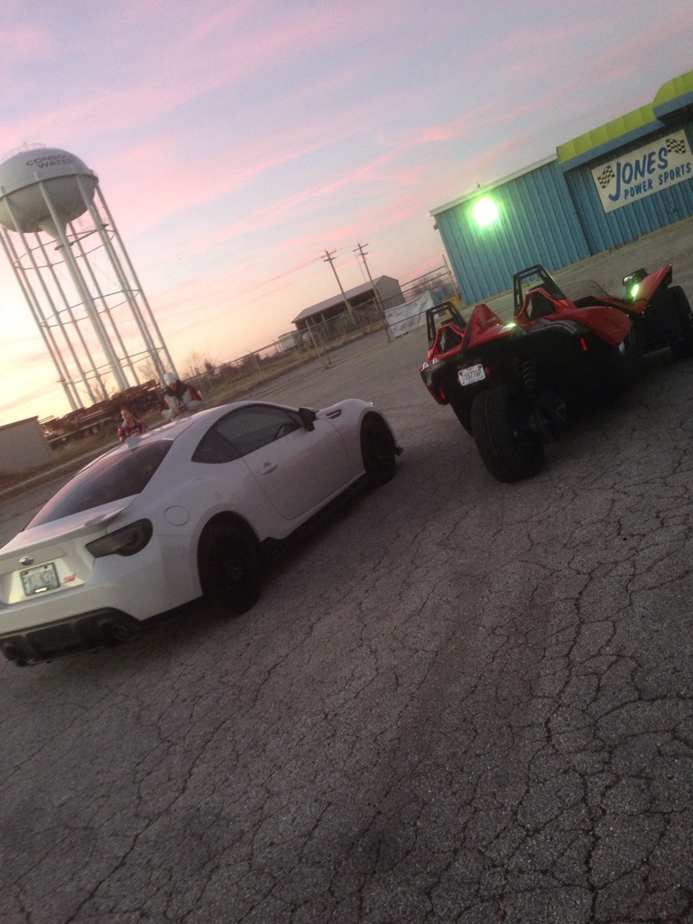 Handling: The slingshot had a lot of feel to it. It was much stiffer all the way around. Everything felt very tight. It had little roll unless you were really hammering into a corner. The steering was stiff, the clutch and throttle was stiff. The short throw shifter was buttery smooth. I don't mean stiff in a bad sense, more of just complete opposite of the BRZ. For example: the throttle was instant, short and very tight engagement on the clutch. BRZ... I find myself blipping the throttle before taking off because the first 20% of the thorttle is so soft. On the bumpy missouri back road you felt a lot more than you wanted to. On a highway or smooth road it isn't bad at all. For the average person, if you blindfolded them, stuck them in it, had them take it for a drive. They would not know it had 3 wheels. (I'll go more in depth upon request, it may not make sense to certain people and I can try to explain better.) Lower than the twin? I do feel that I was sitting lower than the twin. Looking onto the hood literally feels like your driving a bat-mobile. Windshield: The windshield worked great, you look slightly over it. When cresting a hill you look through it a little but it's not too bad. You don't get a lot of turbulence from the air, it kicks it over pretty well. Helmet: 100 without, 120mph with a basic 3/4 helmet. You sit pretty low in it with the sides coming up not very far. It is very open on the sides.. With a low speed roll over I think you'd be good, high speed.. not so much. |