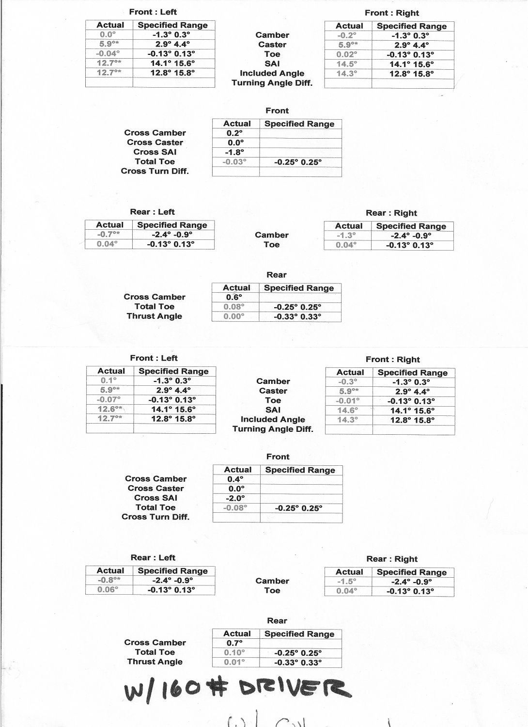 I'm surprised how much my weight affects the static alignment specs. The top printout is from the car empty and the bottom with me in it. I'll be using either concentric bolts or plates to get camber adjustment in the fronts, and will equal out the rear. I prefer zero cross/camber and zero cross caster, both front and rear, with zero toe in front and a touch of toe-in in the rear for braking stability. Input on this subject is appreciated Attachment 8080 |