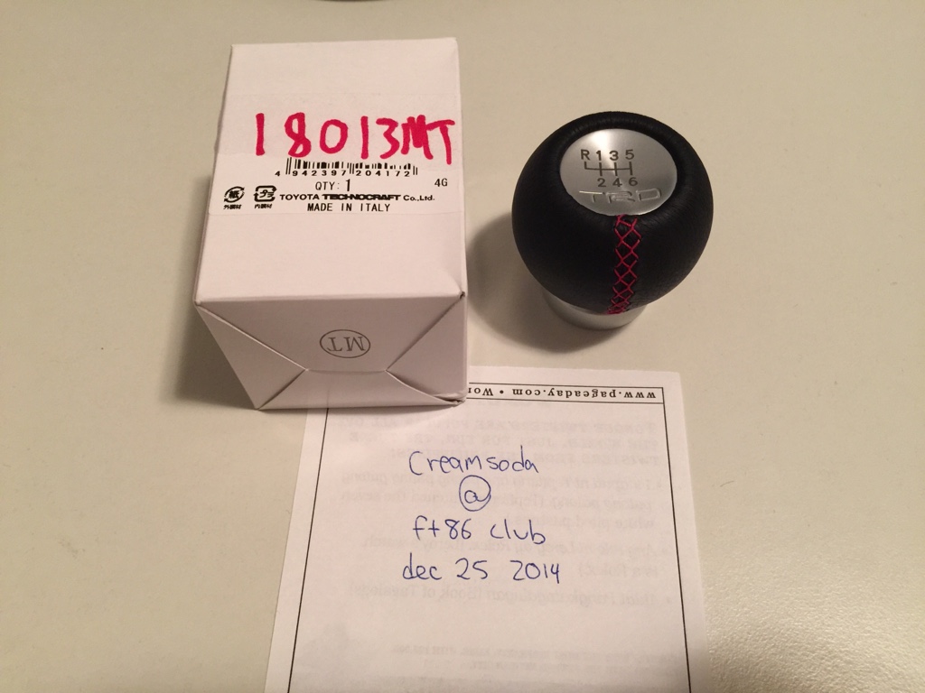 Official genuine TRD shift knob - not a replica - you can tell by the neat stitching, the positioning of the gate labels, and that it's made in Italy, not Japan. Yes, the real ones are made in Italy. Got it as a gift, only selling because it's too light for my taste.. $130 Attachment 99023Attachment 99024 |