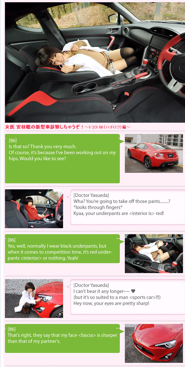 I am sure many of you have seen the curious gallery of images featuring an attractive young Japanese lady in what appears to be a lab coat. I was curious too, and I needed to practice my Japanese, so I have translated the accompanying article for your reading pleasure! I'm no expert at the language, so don't hate on me if you notice any mistakes, but I think I got the general meaning across. Ahh, those crazy Japanese... Enjoy! Attachment 8362 Attachment 8363 Attachment 8364 Attachment 8365 Attachment 8366 Attachment 8367 Attachment 8368 NOTE: Original photos and article is not mine. It can be found here: http://autoc-one.jp/toyota/86/joycar-979000/ (As a side note, Joy Car is a play on words: 女医 (Jo-i, female doctor). Clever!) |
