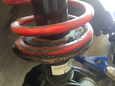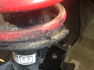 Here's a few pictures: Attachment 107945 Attachment 107946 Attachment 107947 And yes I searched to see what a blown strut looks like and found many pictures similar but worse then how mine looks. I'm asking for your input because I'm no expert on suspension. The only experience I have is removing the struts and springs when I installed my swift springs following the DIY on this forum. I installed my swift springs in march of last year and in the last few months have been hearing a clanking or metal on metal noise at slow speeds(<30) mainly when turning right only while going over uneven surfaces. A few weeks ago I was at the dealership to have the 15K maintenance done and had them look at it, without me knowing what the problem was. I rode along with the tech and he was able to duplicate the noise and believed it was a bad ball joint. So when we got back to the dealership he put the car back on the lift and comes back to me and says that they will have to order the ball joint. He also told me "your coil spring is really dirty with sand and dirt trapped, I'll clean it off and that should solve your problem, but we will still order the ball joint and replace it under warranty for you." Now I'm not griping about the dealer experience as I was surprised he was still willing to replace the ball joint. Now that I have taken the wheels off and looked at the springs myself the driver side is the only one like this, the passenger side looks just like the day I installed it plus a bit of dirt but nowhere near what the driver side looks like. I'd appreciate any helpful input! :thanks: |