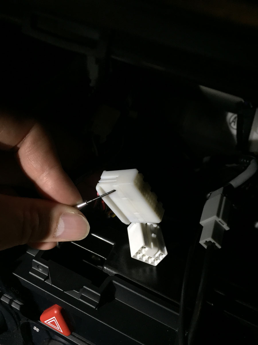 P@ul, wow, thanks for the info. I ended up picking up some 16 gauge cable from Home Depot and extending the Camera's black and red wires to the HU and used the (black) ground wire and 12v (red) wire there. For the reverse signal input I used SVXdc's 28-pin harness and 4-ft wire (one end has a pin termination that slides into the OEM harness) to tap into the kickpanel's pin#5. As for the trunk rubber hose, my 10 Series has extra wiring going through there, so there isn't enough room to route the wire though easily. Since the cable has two parts and I extended the red/black wires - the two halves meet in the trunk. This will allow me to disconnect the camera easily, if I ever choose to swap out the license plate frame. Attachment 111151 28-pin OEM Harness without Reverse Gear Signal Wire in Pin #2 Attachment 111152 Using small flat head screwdriver to unlock the harness shell Attachment 111153 After installing SVXdc's 4ft wire into the OEM 28-pin Harness Attachment 111154 Posi-Tap into pink wire #5 near kickpanel |