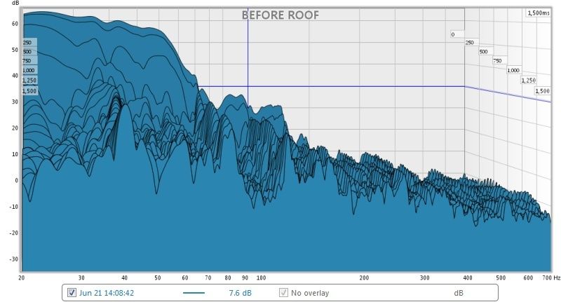 This is the decay plot of a car that has been fully deadened except for the roof. Notice how frequencies continue to resonate as long as 1.5 seconds.